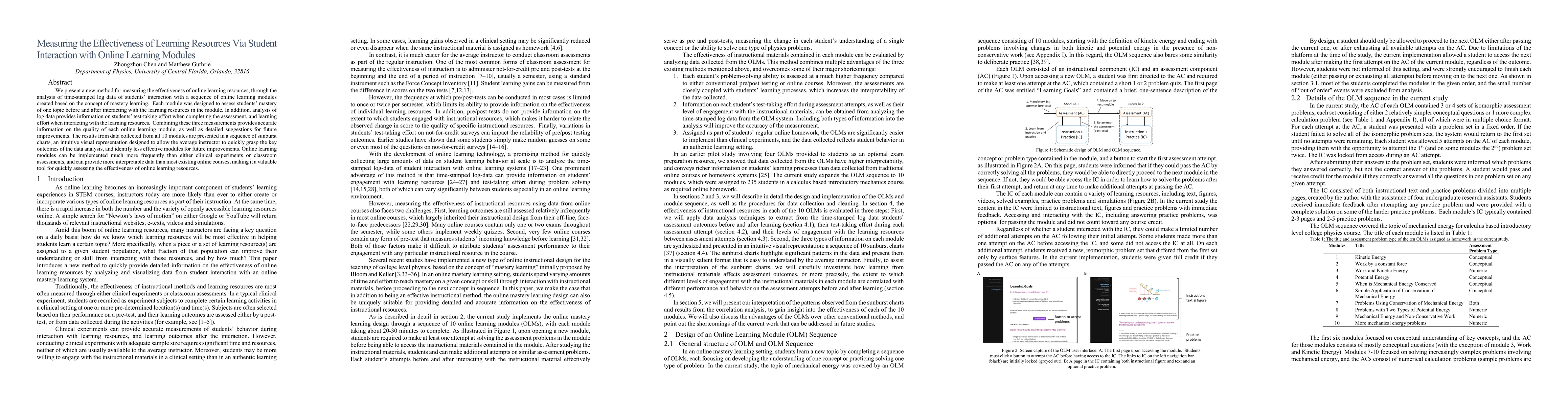 A new method measures online learning resource effectiveness by analyzing student log data, providing detailed suggestions for improvement. The results help instructors quickly assess module quality and identify areas for future enhancements.