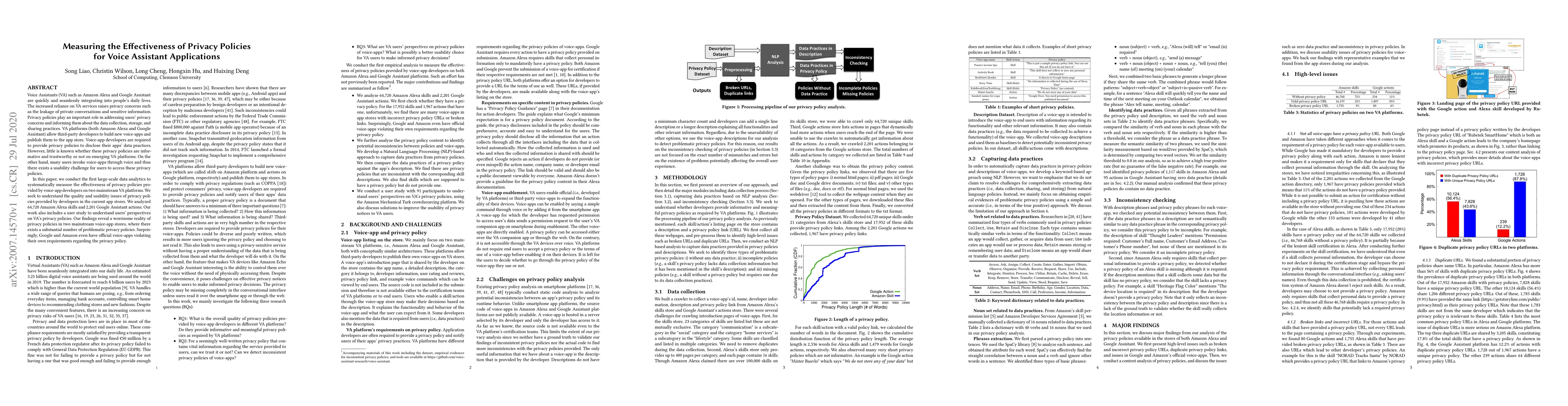 This paper measures the effectiveness of privacy policies for voice assistant applications on Amazon Alexa and Google Assistant, revealing significant issues in quality and usability. Findings from an analysis of 64,720 Alexa skills and 2,201 Google Assistant actions, along with a user study, show many problematic policies, including some official apps violating their own privacy guidelines.