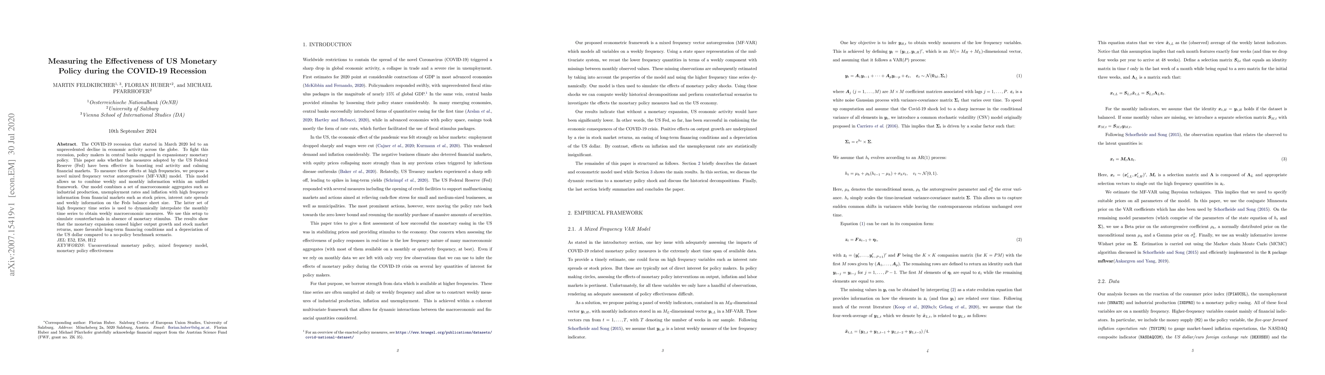 The paper employs a mixed frequency vector autoregressive (MF-VAR) model to measure the effectiveness of US monetary policy during the COVID-19 recession. This model combines weekly and monthly macroeconomic and financial market data to dynamically interpolate monthly time series and obtain weekly measures of low-frequency variables.