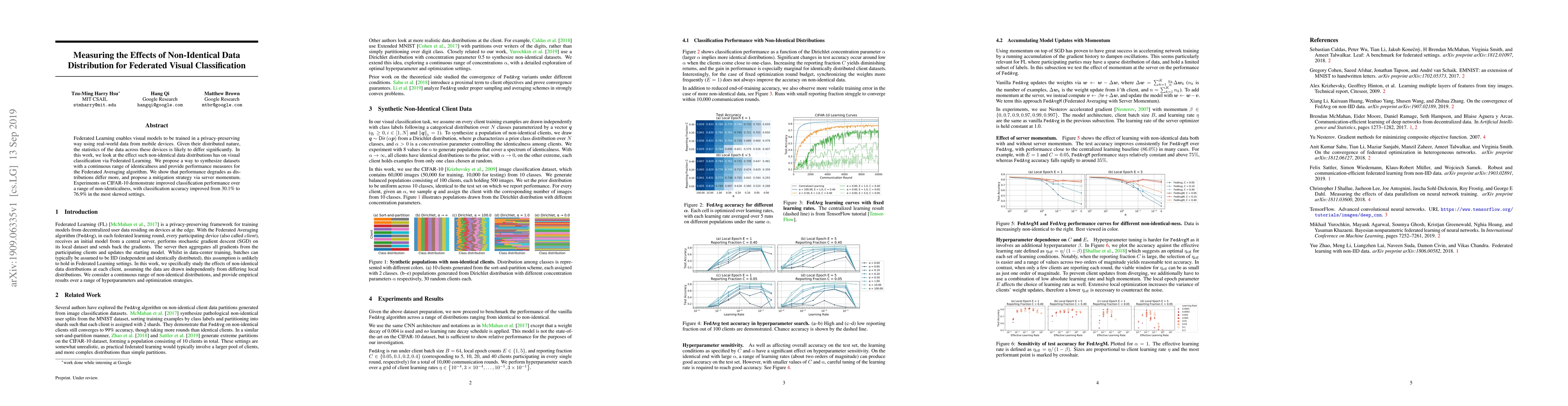 Federated Learning enables visual models to be trained in a privacy-preserving way using real-world data from mobile devices. Given their distributed nature, the statistics of the data across these devices is likely to differ significantly. In this work, we look at the effect such non-identical data distributions has on visual classification via Federated Learning. We propose a way to synthesize datasets with a continuous range of identicalness and provide performance measures for the Federated Averaging algorithm. We show that performance degrades as distributions differ more, and propose a mitigation strategy via server momentum. Experiments on CIFAR-10 demonstrate improved classification performance over a range of non-identicalness, with classification accuracy improved from 30.1% to 76.9% in the most skewed settings.