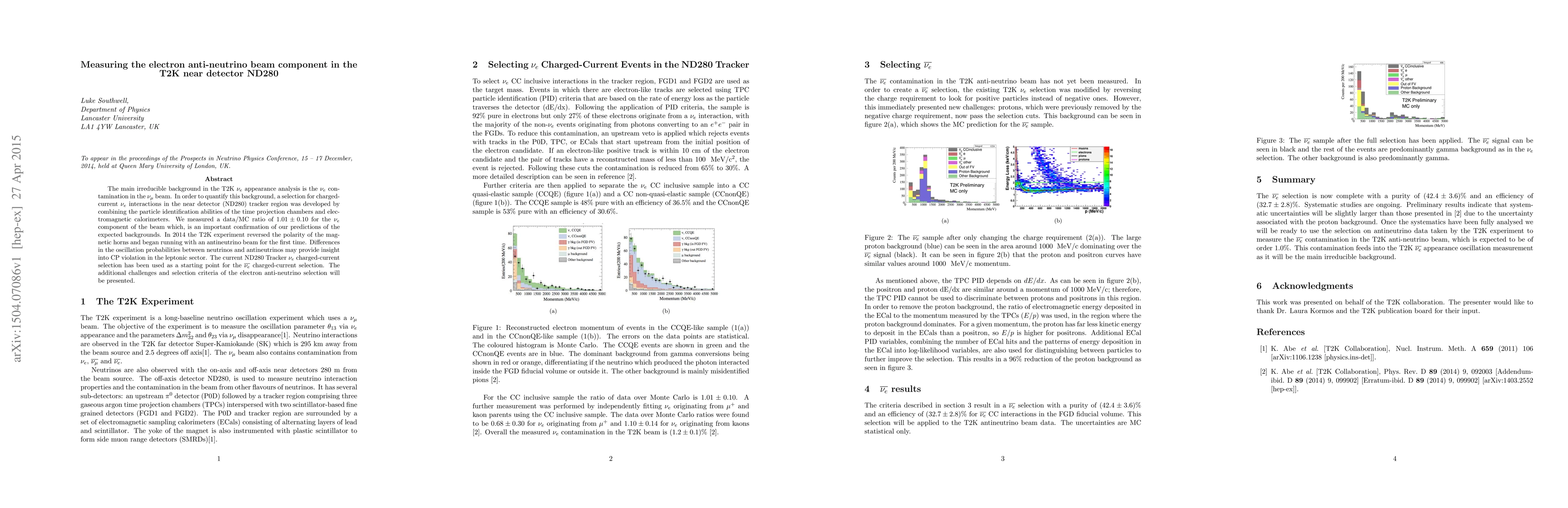 The T2K experiment has measured a data/MC ratio of 1.01 ±0 for the electron anti-neutrino component of its beam, confirming predictions of expected backgrounds.