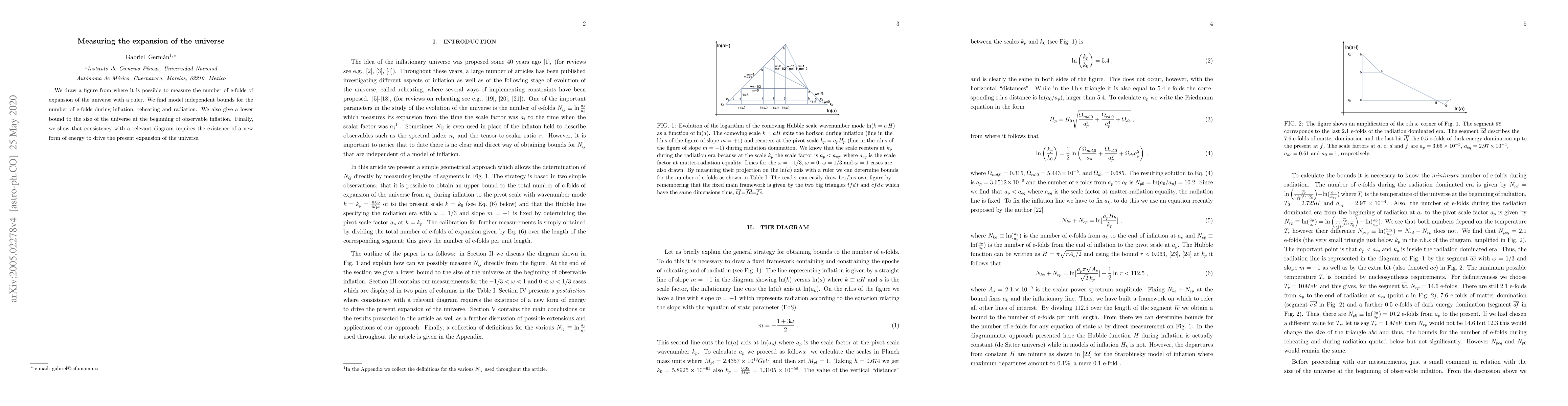 We draw a figure from where it is possible to measure the number of e-folds of expansion of the universe with a ruler. We find model independent bounds for the number of e-folds during inflation, reheating and radiation. We also give a lower bound to the size of the universe at the beginning of observable inflation. Finally, we show that consistency with a relevant diagram requires the existence of a new form of energy to drive the present expansion of the universe.