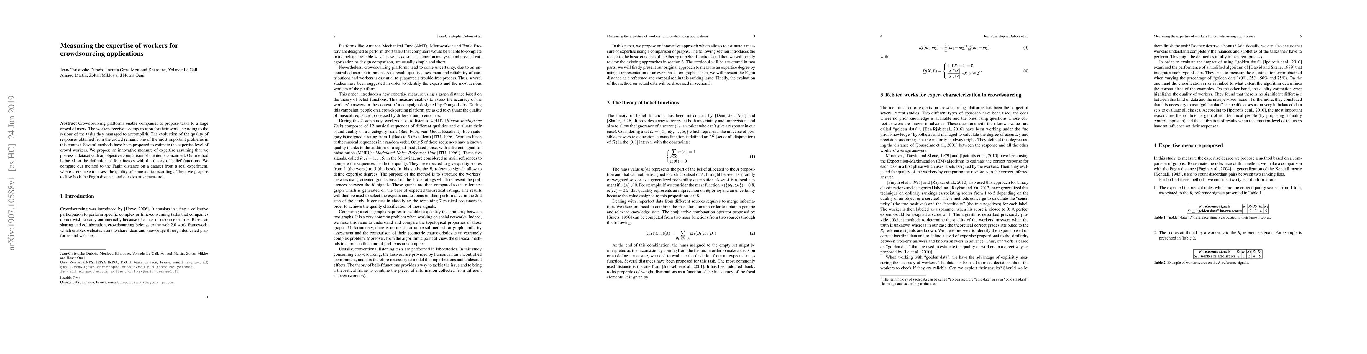 This research introduces a novel method to gauge worker expertise in crowdsourcing using belief function theory, focusing on factors like task accuracy and consistency. The method is tested against the Fagin distance on audio quality assessment data, showing potential for improved accuracy when combined.