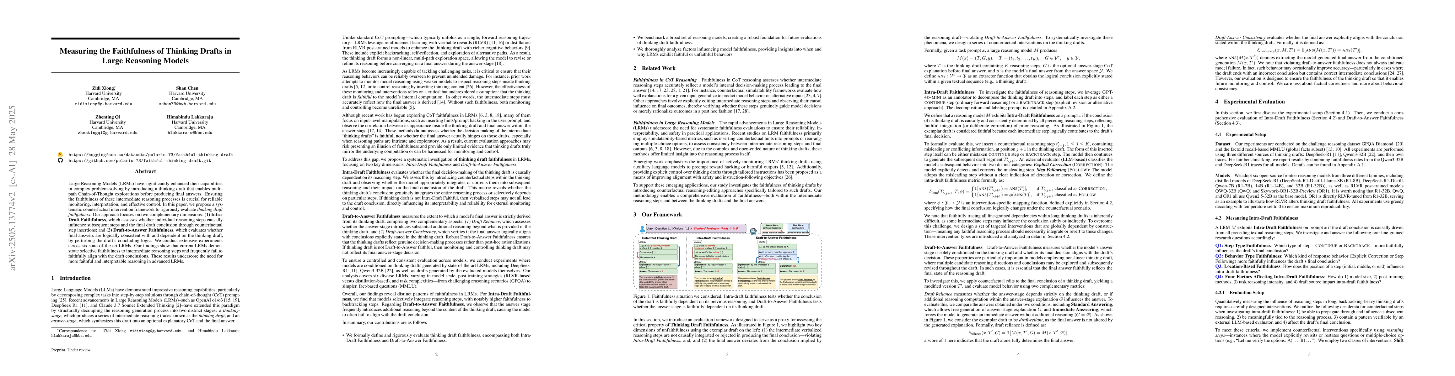 The paper proposes a counterfactual intervention framework to evaluate the faithfulness of thinking drafts in Large Reasoning Models (LRMs). This framework assesses two dimensions: Intra-Draft Faithfulness and Draft-to-Answer Faithfulness.