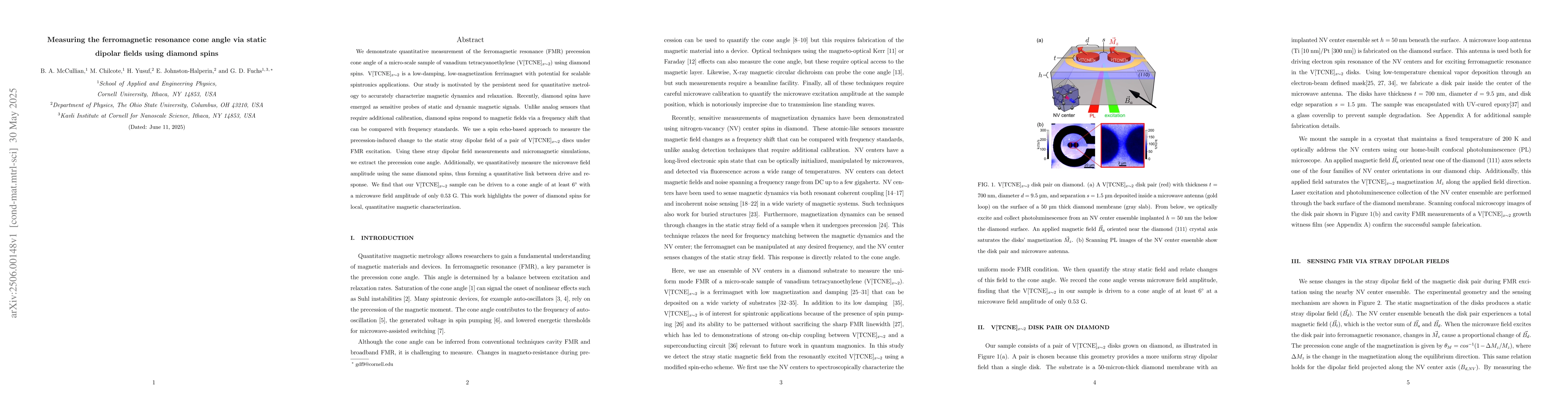 Researchers measured the cone angle of a micro-scale vanadium tetracyanoethylene sample using diamond spins, achieving a drive field of 0.53 G, and demonstrated a new method for quantitative magnetic characterization.