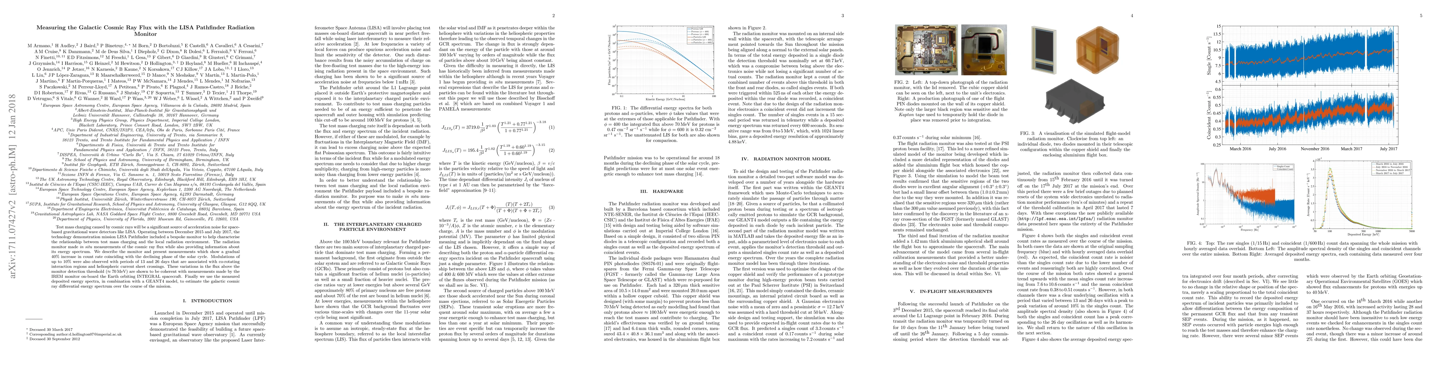 The LISA Pathfinder mission's bespoke radiation monitor measured the galactic cosmic ray flux, revealing a 40% increase in count rate during the solar cycle's decline, alongside 10% modulations linked to solar activity. The monitor's data was coherent with INTEGRAL spacecraft measurements, aiding in estimating the galactic cosmic ray differential energy spectrum.