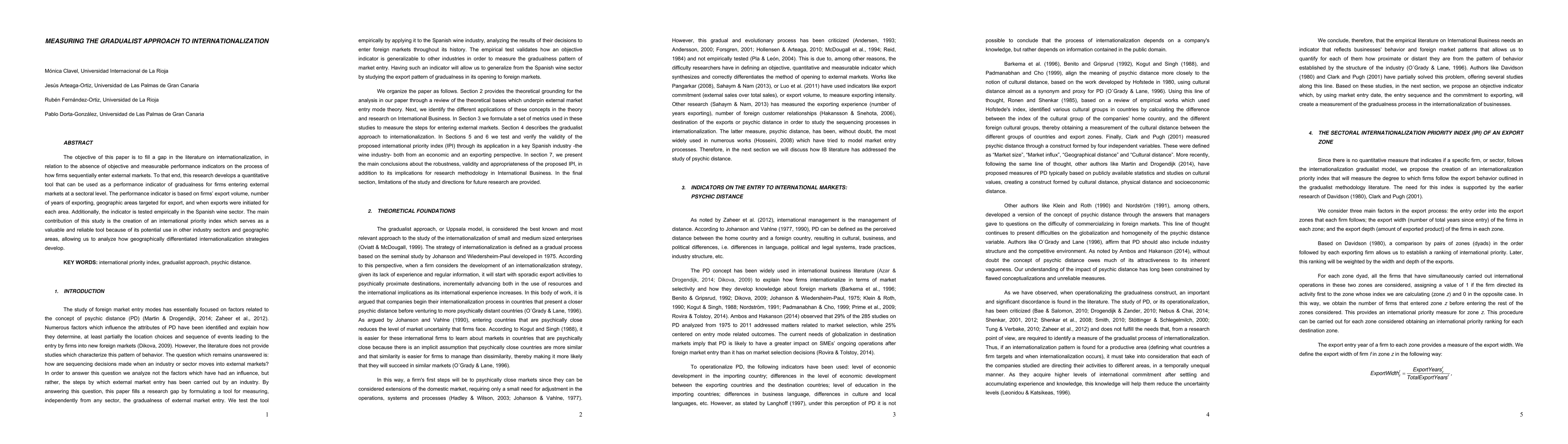 The objective of this paper is to fill a gap in the literature on internationalization, in relation to the absence of objective and measurable performance indicators on the process of how firms sequentially enter external markets. To that end, this research develops a quantitative tool that can be used as a performance indicator of gradualness for firms entering external markets at a sectoral level. The performance indicator is based on firms' export volume, number of years of exporting, geographic areas targeted for export, and when exports were initiated for each area. Additionally, the indicator is tested empirically in the Spanish wine sector. The main contribution of this study is the creation of an international priority index which serves as a valuable and reliable tool because of its potential use in other industry sectors and geographic areas, allowing us to analyze how geographically differentiated internationalization strategies develop.