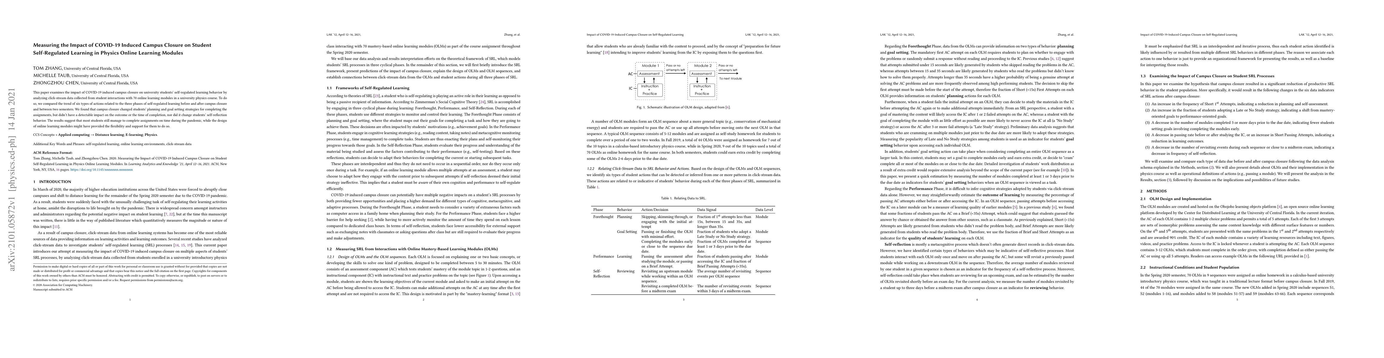 This study analyzes the effect of COVID-19-induced campus closures on university students' self-regulated learning in online physics modules, finding changes in planning and goal setting but no impact on completion time or self-reflection. The online module design appears to support timely assignment completion.