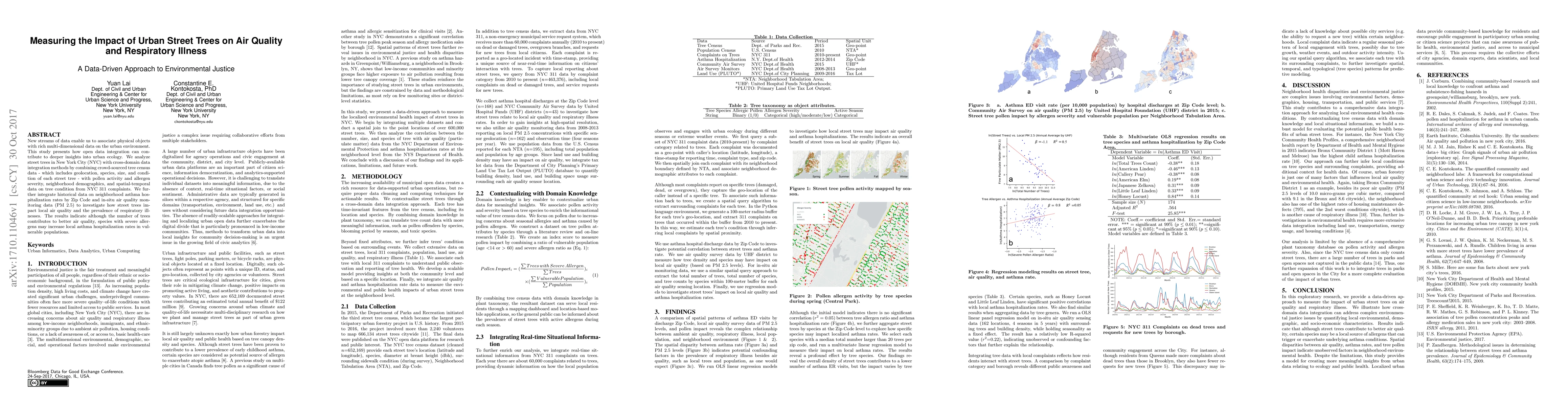 This study in NYC uses combined datasets on street trees, pollen, demographics, tree conditions, asthma rates, and air quality to find that while more trees improve air quality, certain high-allergen species may increase asthma hospitalizations, especially in vulnerable communities.