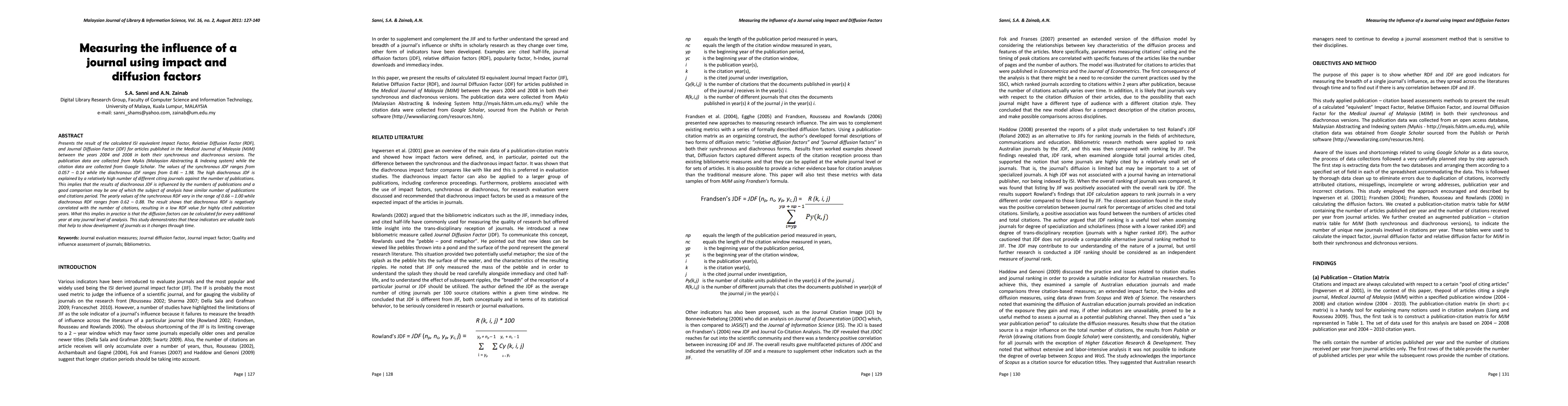Presents the result of the calculated IS! equivalent Impact Factor, Relative Diffusion Factor (RDF), and Journal Diffusion Factor (JDF) for articles published in the Medical Journal of Malaysia (MJM) between the years 2004 and 2008 in both their synchronous and diachronous versions. The publication data are collected from MyAis (Malaysian Abstracting & Indexing system) while the citation data are collected from Google Scholar. The values of the synchronous JDF ranges from 0.057 - 0.14 while the diachronous JDF ranges from 0.46 - 1.98. The high diachronous JDF is explained by a relatively high number of different citing journals against the number of publications. This implies that the results of diachronous JDF is influenced by the numbers of publications and a good comparison may be one of which the subject of analysis have similar number of publications and citations period. The yearly values of the synchronous RDF vary in the range of 0.66 - 1.00 while diachronous RDF ranges from 0.62 - 0.88. The result shows that diachronous RDF is negatively correlated with the number of citations, resulting in a low RDF value for highly cited publication years. What this implies in practice is that the diffusion factors can be calculated for every additional year at any journal level of analysis. This study demonstrates that these indicators are valuable tools that help to show development of journals as it changes through time.