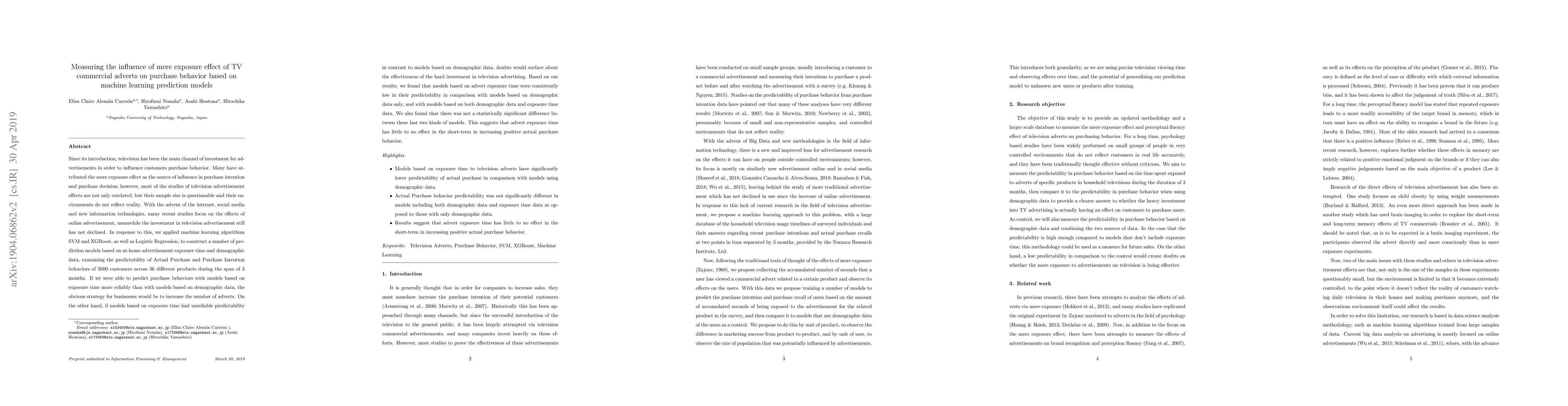Since its introduction, television has been the main channel of investment for advertisements in order to influence customers purchase behavior. Many have attributed the mere exposure effect as the source of influence in purchase intention and purchase decision; however, most of the studies of television advertisement effects are not only outdated, but their sample size is questionable and their environments do not reflect reality. With the advent of the internet, social media and new information technologies, many recent studies focus on the effects of online advertisement, meanwhile, the investment in television advertisement still has not declined. In response to this, we applied machine learning algorithms SVM and XGBoost, as well as Logistic Regression, to construct a number of prediction models based on at-home advertisement exposure time and demographic data, examining the predictability of Actual Purchase and Purchase Intention behaviors of 3000 customers across 36 different products during the span of 3 months. If models based on exposure time had unreliable predictability in contrast to models based on demographic data, doubts would surface about the effectiveness of the hard investment in television advertising. Based on our results, we found that models based on advert exposure time were consistently low in their predictability in comparison with models based on demographic data only, and with models based on both demographic data and exposure time data. We also found that there was not a statistically significant difference between these last two kinds of models. This suggests that advert exposure time has little to no effect in the short-term in increasing positive actual purchase behavior.