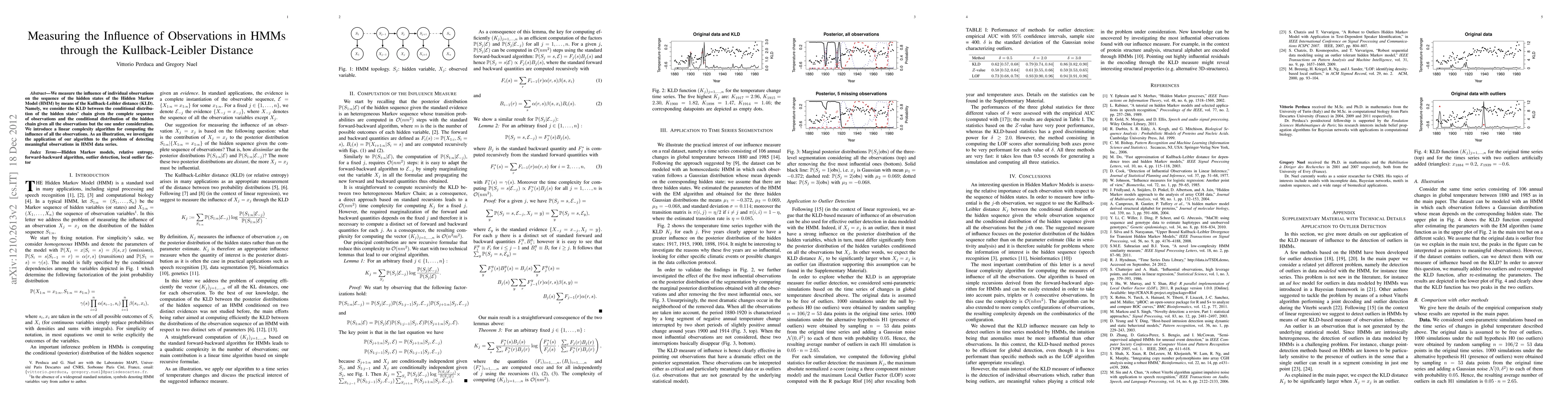 This paper proposes a method to measure the influence of individual observations on hidden states in Hidden Markov Models (HMMs) using the Kullback-Leibler distance (KLD). It introduces a linear complexity algorithm for computing these influences and demonstrates its application in detecting outliers in HMM data series.