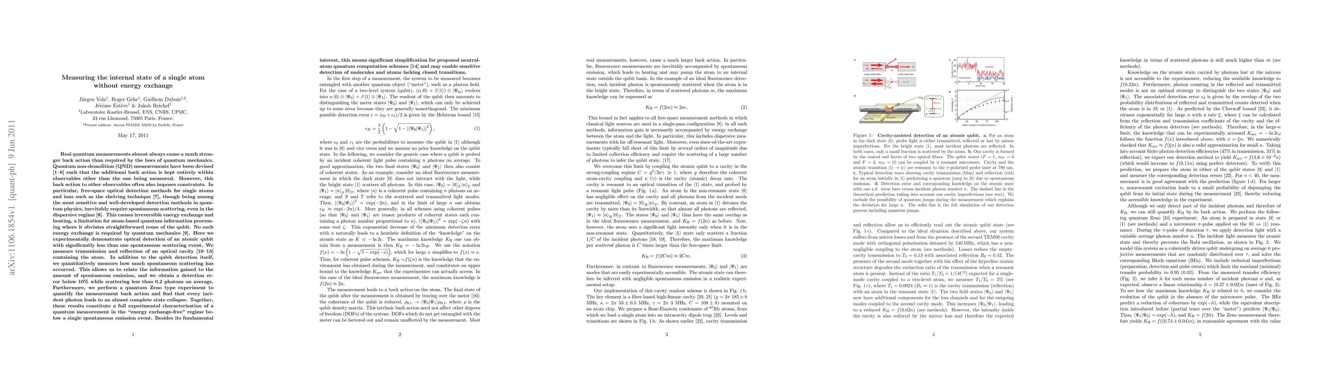 Real quantum measurements almost always cause a much stronger back action than required by the laws of quantum mechanics. In particular, free-space optical detection methods for single atoms and ions such as the shelving technique, though being among the most sensitive detection methods in quantum physics, inevitably require spontaneous scattering, even in the dispersive regime. This causes heating, a limitation for atom-based quantum information processing where it obviates straightforward reuse of the qubit. No such energy exchange is required by quantum mechanics. Here we experimentally demonstrate optical detection of an atomic qubit with significantly less than one spontaneous scattering event. We measure transmission and reflection of an optical cavity containing the atom. In addition to the qubit detection itself, we quantitatively measure how much spontaneous scattering has occurred. This allows us to relate the information gained to the amount of spontaneous emission, and we obtain a detection error below 10% while scattering less than 0.2 photons on average. Furthermore, we perform a quantum Zeno type experiment to quantify the measurement back action and find that every incident photon leads to an almost complete state collapse. Together, these results constitute a full experimental characterization of a quantum measurement in the "energy exchange-free" regime below a single spontaneous emission event. Besides its fundamental interest, this means significant simplification for proposed neutral-atom quantum computation schemes and may enable sensitive detection of molecules and atoms lacking closed transitions.
