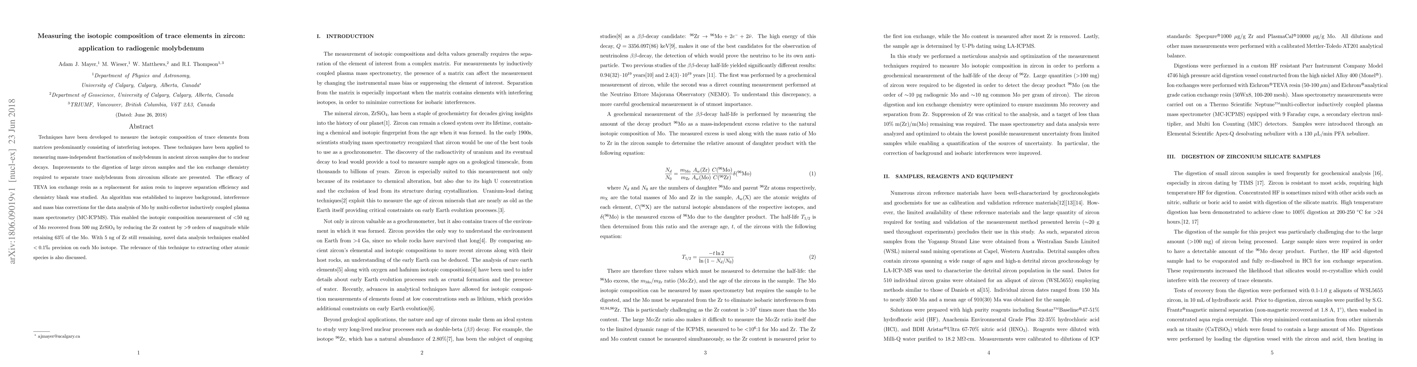 Techniques have been developed to measure the isotopic composition of trace elements from matrices predominantly consisting of interfering isotopes. These techniques have been applied to measuring mass-independent fractionation of molybdenum in ancient zircon samples due to nuclear decays. Improvements to the digestion of large zircon samples and the ion exchange chemistry required to separate trace molybdenum from zirconium silicate are presented. The efficacy of TEVA ion exchange resin as a replacement for anion resin to improve separation efficiency and chemistry blank was studied. An algorithm was established to improve background, interference and mass bias corrections for the data analysis of Mo by multi-collector inductively coupled plasma mass spectrometry (MC-ICPMS). This enabled the isotopic composition measurement of $<$50 ng of Mo recovered from 500 mg ZrSiO$_4$ by reducing the Zr content by $>$9 orders of magnitude while retaining 63% of the Mo. With 5 ng of Zr still remaining, novel data analysis techniques enabled $<$0.1 permil precision on each Mo isotope. The relevance of this technique to extracting other atomic species is also discussed.