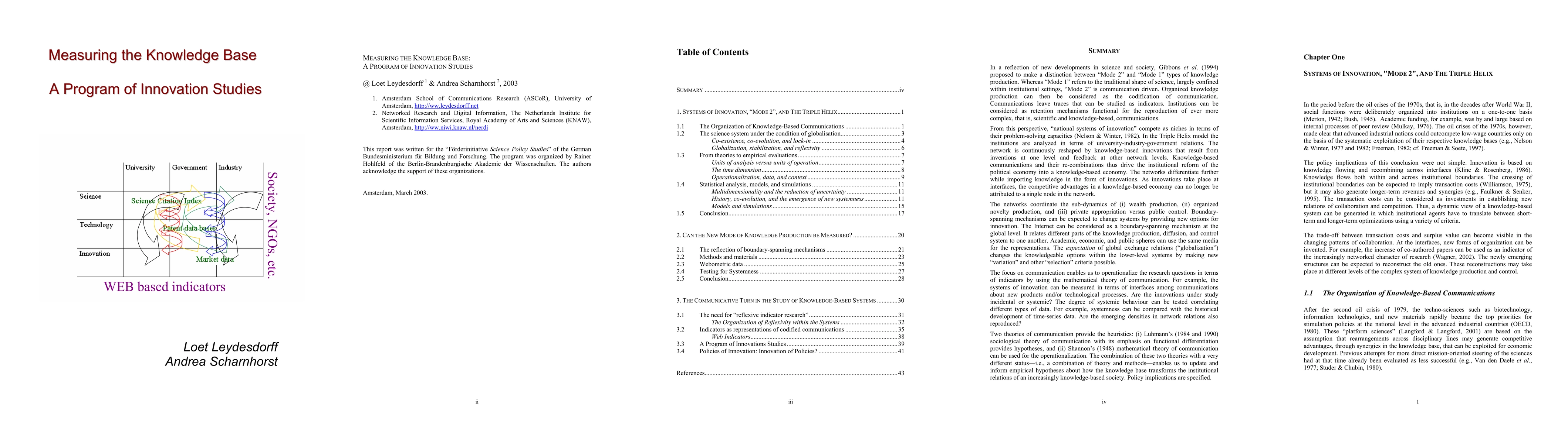 Organized knowledge production can then be considered as the codification of communication. Communications leave traces that can be studied as indicators. Institutions can be considered as retention mechanisms functional for the reproduction of ever more complex, that is, scientific and knowledge-based, communications. The focus on communication enables us to operationalize the research questions in terms of indicators by using the mathematical theory of communication. The combination of two theories with a very different status--i.e., a combination of theory and methods--enables us to update and inform empirical hypotheses about how the knowledge base transforms the institutional relations of an increasingly knowledge-based society. Policy implications are specified.