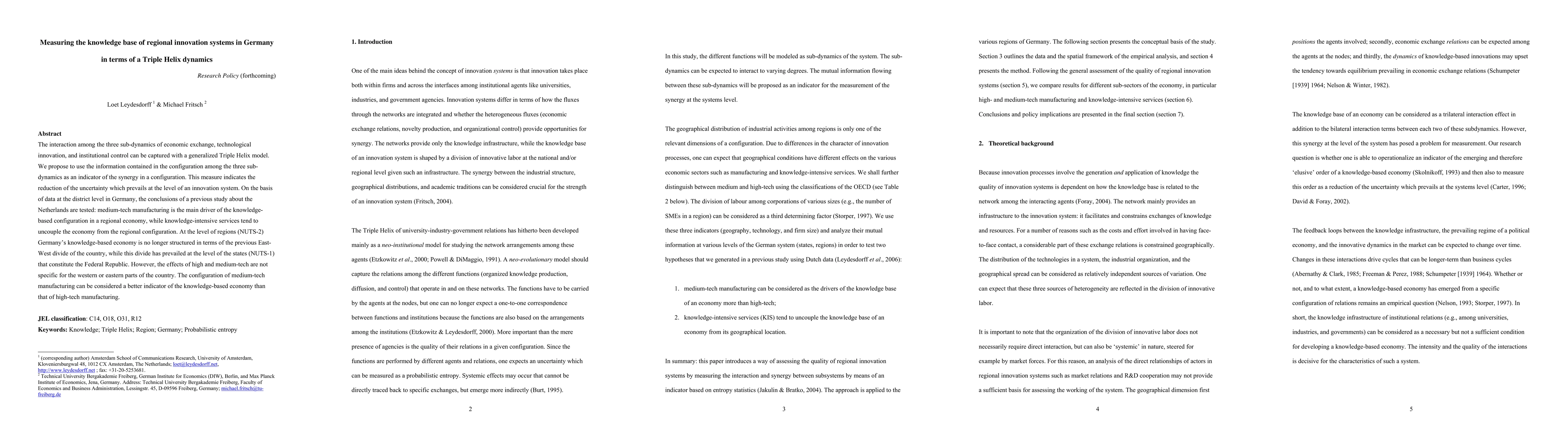 This paper measures the synergy in Germany's regional innovation systems using a Triple Helix model, finding that medium-tech manufacturing drives knowledge-based configurations, while high-tech manufacturing is less effective. The regional knowledge-based economy transcends the historical East-West divide at the district level.