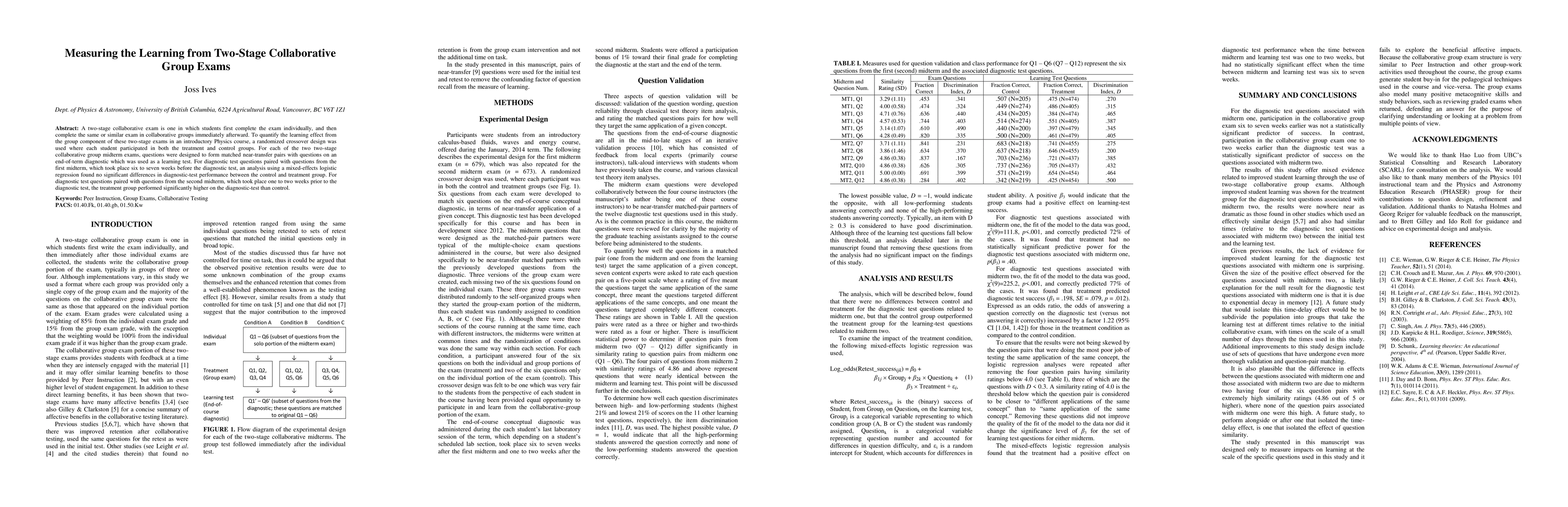 This study investigates the learning gains from a two-stage collaborative group exam in an introductory Physics course, finding no significant difference in learning six to seven weeks later but a significant improvement in learning one to two weeks later. The randomized crossover design allowed each student to experience both the treatment and control groups.