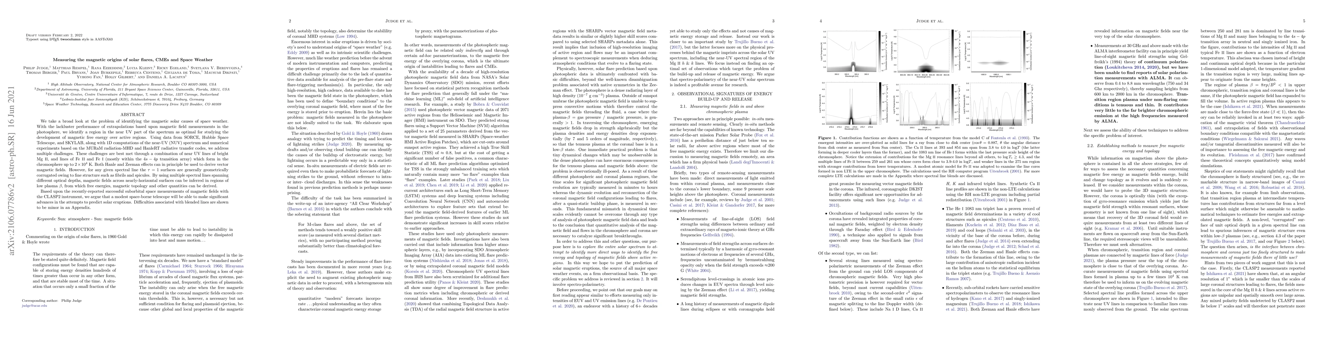 We take a broad look at the problem of identifying the magnetic solar causes of space weather. With the lackluster performance of extrapolations based upon magnetic field measurements in the photosphere, we identify a region in the near UV part of the spectrum as optimal for studying the development of magnetic free energy over active regions. Using data from SORCE, Hubble Space Telescope, and SKYLAB, along with 1D computations of the near-UV (NUV) spectrum and numerical experiments based on the MURaM radiation-MHD and HanleRT radiative transfer codes, we address multiple challenges. These challenges are best met through a combination of near UV lines of bright \ion{Mg}{2}, and lines of \ion{Fe}{2} and \ion{Fe}{1} (mostly within the $4s-4p$ transition array) which form in the chromosphere up to $2\times10^4$ K. Both Hanle and Zeeman effects can in principle be used to derive vector magnetic fields. However, for any given spectral line the $\tau=1$ surfaces are generally geometrically corrugated owing to fine structure such as fibrils and spicules. By using multiple spectral lines spanning different optical depths, magnetic fields across nearly-horizontal surfaces can be inferred in regions of low plasma $\beta$, from which free energies, magnetic topology and other quantities can be derived. Based upon the recently-reported successful suborbital space measurements of magnetic fields with the CLASP2 instrument, we argue that a modest space-borne telescope will be able to make significant advances in the attempts to predict solar eruptions. Difficulties associated with blended lines are shown to be minor in an Appendix.