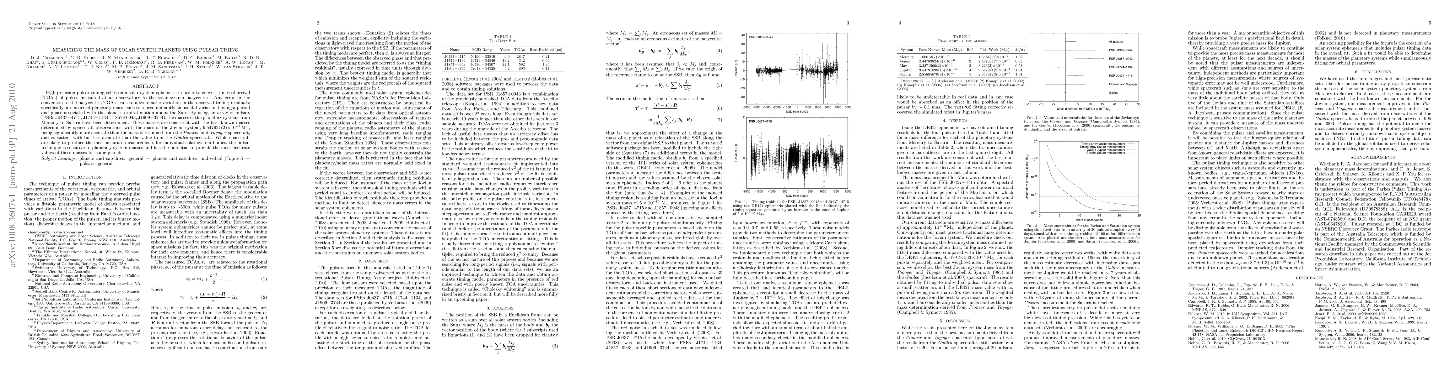 This paper demonstrates that high-precision pulsar timing can accurately measure the masses of solar system planets by analyzing timing residuals, achieving greater accuracy for the Jovian system compared to previous spacecraft measurements. The method shows promise for determining planetary masses with high precision.
