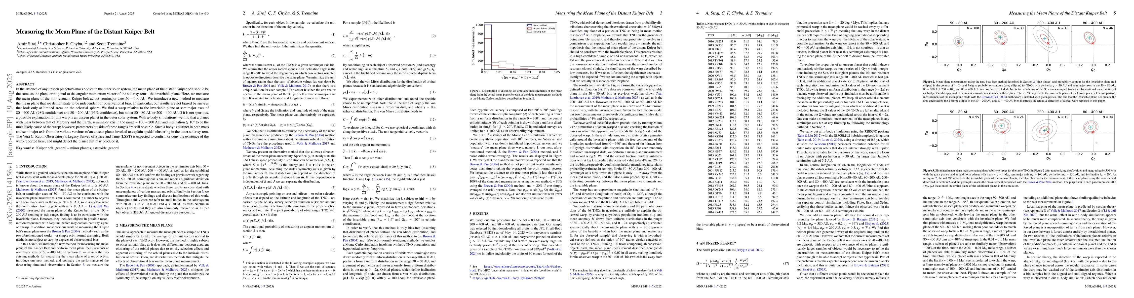 The paper presents a new, bias-free method for measuring the mean plane of the Kuiper Belt by leveraging the distribution of TNO angular momenta, which separates the joint probability of observing a TNO's coordinates and angular momentum direction from selection effects.