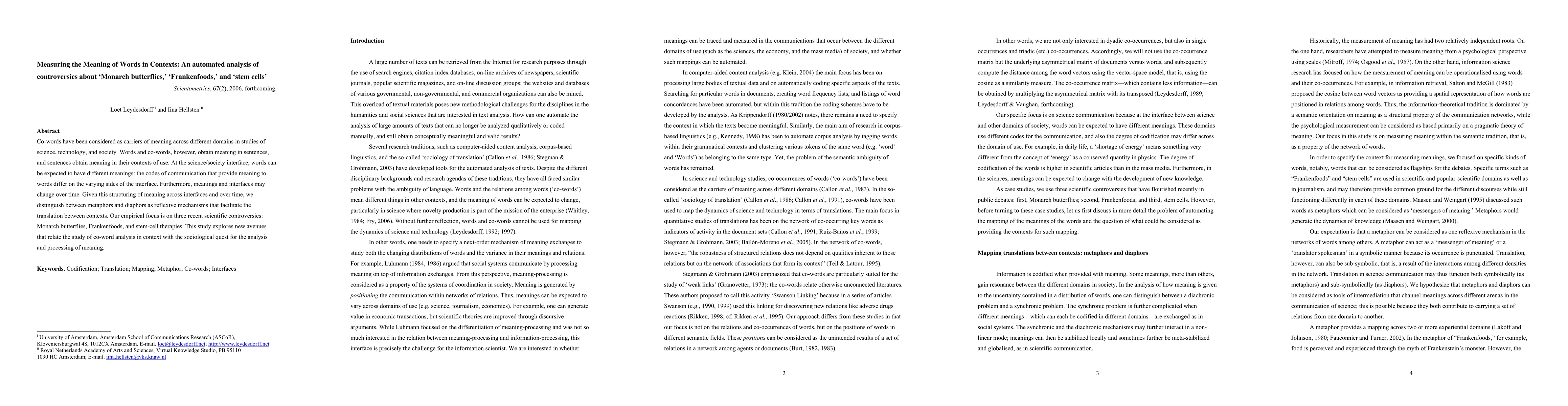 This study employs co-word analysis to explore how the meanings of words in scientific controversies—specifically regarding Monarch butterflies, Frankenfoods, and stem-cell therapies—shift across different societal contexts and over time, utilizing metaphors and diaphors as translation mechanisms. It aims to bridge co-word analysis with sociological meaning-making processes.