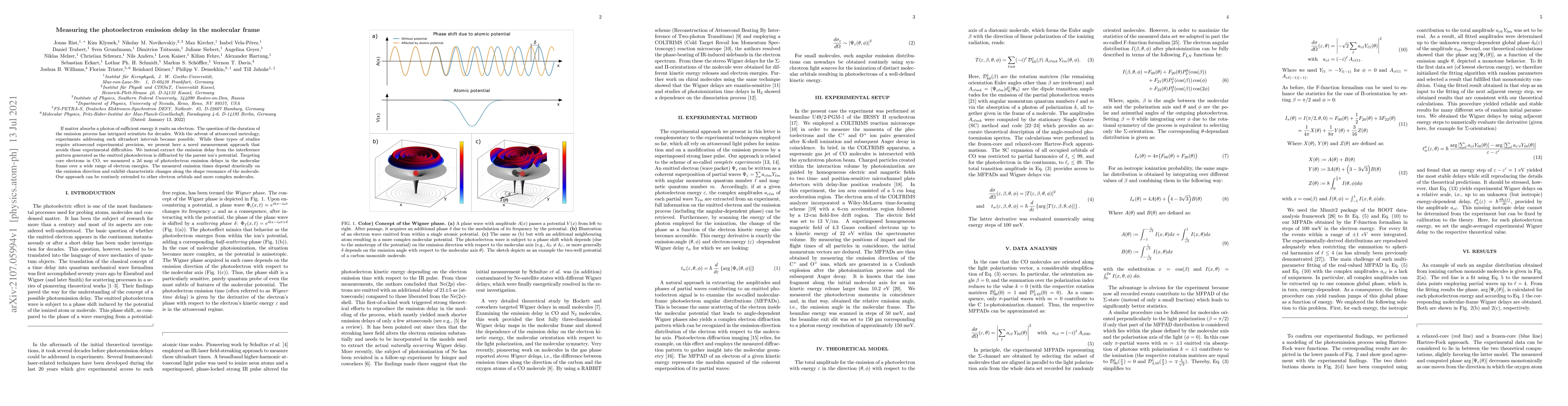 If matter absorbs a photon of sufficient energy it emits an electron. The question of the duration of the emission process has intrigued scientists for decades. With the advent of attosecond metrology, experiments addressing such ultrashort intervals became possible. While these types of studies require attosecond experimental precision, we present here a novel measurement approach that avoids those experimental difficulties. We instead extract the emission delay from the interference pattern generated as the emitted photoelectron is diffracted by the parent ion's potential. Targeting core electrons in CO, we measured a 2d map of photoelectron emission delays in the molecular frame over a wide range of electron energies. The measured emission times depend drastically on the emission direction and exhibit characteristic changes along the shape resonance of the molecule. Our approach can be routinely extended to other electron orbitals and more complex molecules.