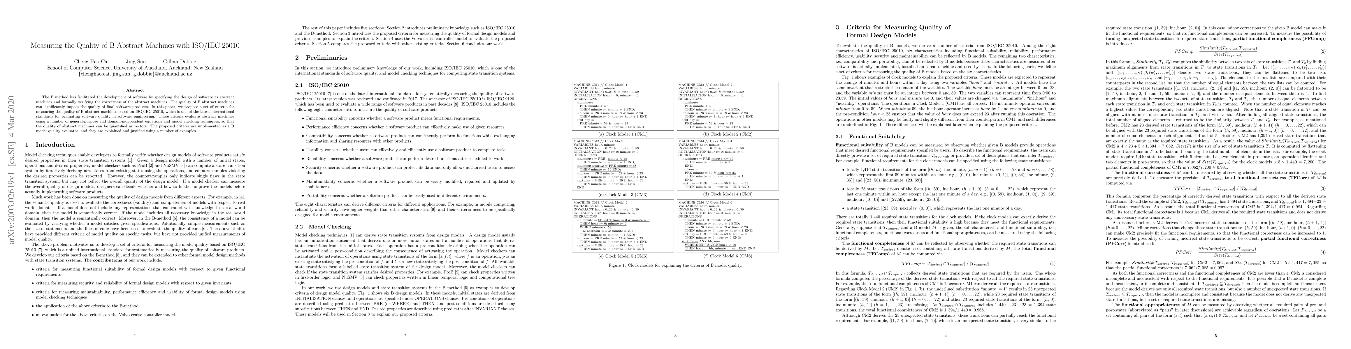 This paper proposes criteria for measuring the quality of B abstract machines based on ISO/IEC 25010 standards, employing general-purpose equations and model checking techniques to quantify quality as vectors. The criteria are implemented in a B model quality evaluator, demonstrated through examples.