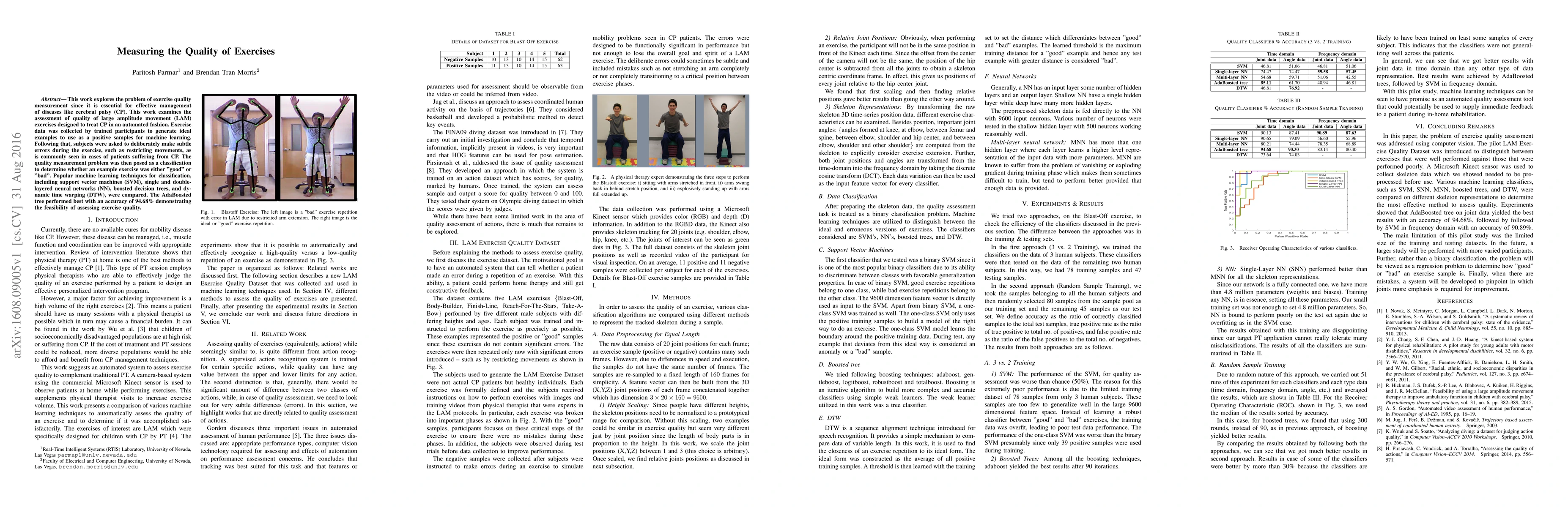 Researchers developed a system to measure exercise quality using machine learning algorithms, achieving an accuracy of 94.68% in distinguishing between good and bad exercises for patients with cerebral palsy. The study's findings demonstrate the feasibility of assessing exercise quality in an automated manner.
