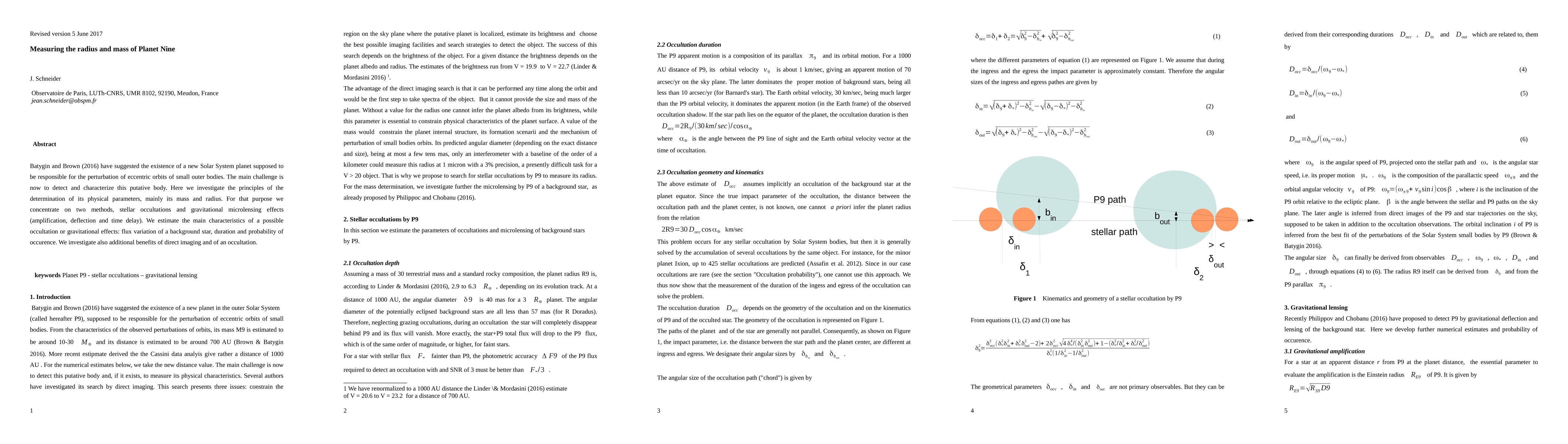 Batygin and Brown (2016) have suggested the existence of a new Solar System planet supposed to be responsible for the perturbation of eccentric orbits of small outer bodies. The main challenge is now to detect and characterize this putative body. Here we investigate the principles of the determination of its physical parameters, mainly its mass and radius. For that purpose we concentrate on two methods, stellar occultations and gravitational microlensing effects (amplification, deflection and time delay). We estimate the main characteristics of a possible occultation or gravitational effects: flux variation of a background star, duration and probability of occurence. We investigate also additional benefits of direct imaging and of an occultation.