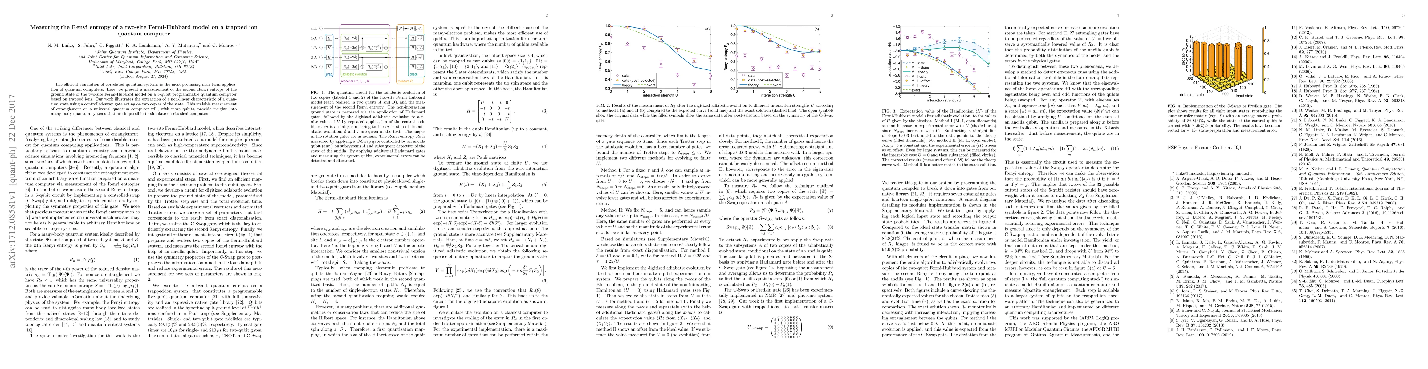 This paper measures the second Renyi entropy of the ground state of a two-site Fermi-Hubbard model on a trapped ion quantum computer, demonstrating a scalable method for extracting entanglement characteristics using a controlled-swap gate. This approach provides insights into many-body quantum systems beyond classical simulation capabilities.