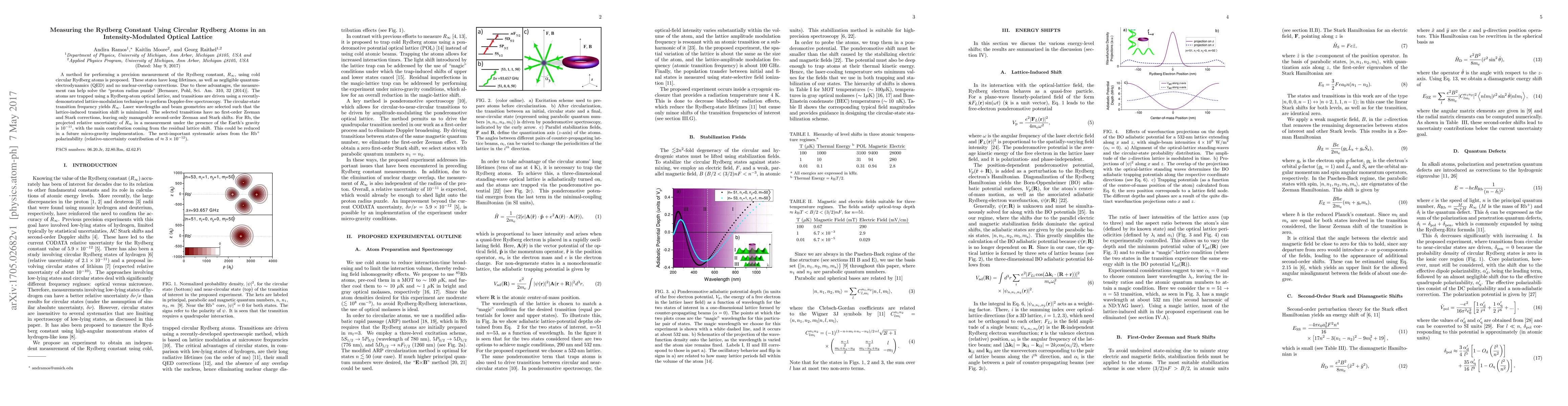 The paper proposes a method to precisely measure the Rydberg constant ($R_{infty}$) using cold circular Rydberg atoms, which have long lifetimes and minimal QED and nuclear-overlap corrections. This technique, employing a Rydberg-atom optical lattice and lattice-modulation for Doppler-free spectroscopy, aims to resolve the 'proton radius puzzle'. The method projects a $10^{-11}$ relative uncertainty for Rb under Earth's gravity, with lattice shift and Rb$^+$ polarizability as main systematic contributions.