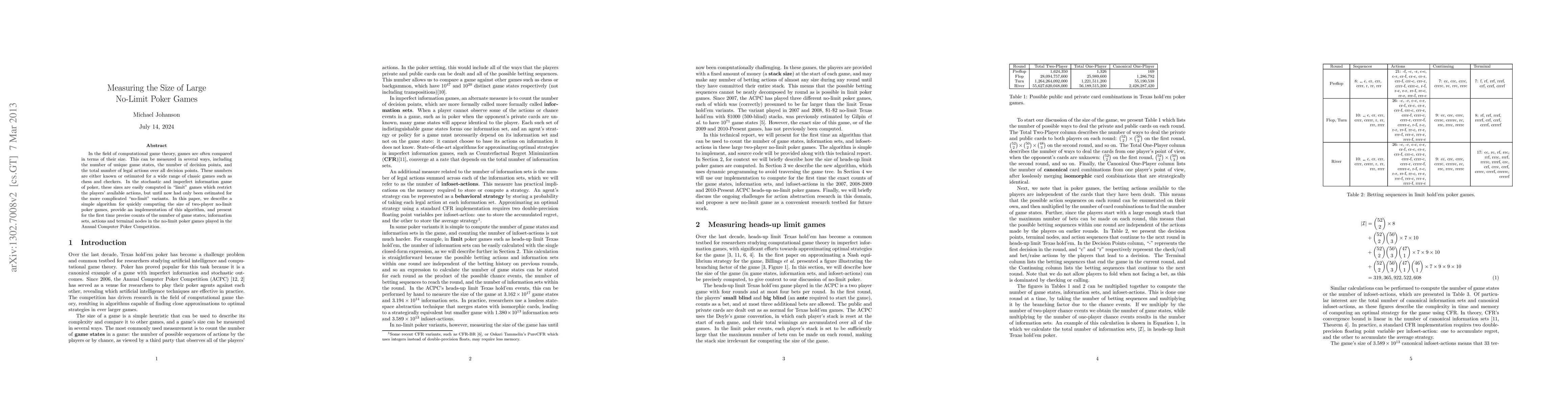 This paper presents an algorithm to compute the size of large no-limit poker games, providing precise counts for game states, information sets, actions, and terminal nodes for the first time. The results are applied to the games played in the Annual Computer Poker Competition.