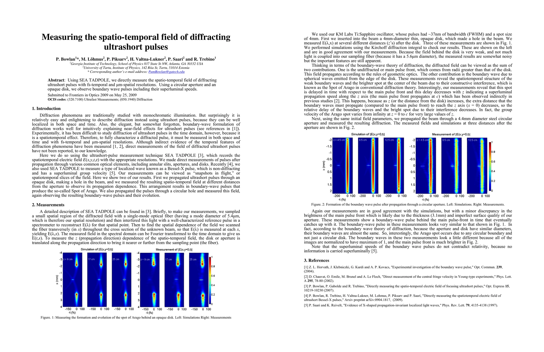 Summary: This study employs SEA TADPOLE to measure the spatio-temporal field of diffracting ultrashort pulses with high temporal and spatial resolution, revealing boundary wave pulses and their superluminal speeds through experiments using a circular aperture and an opaque disk.