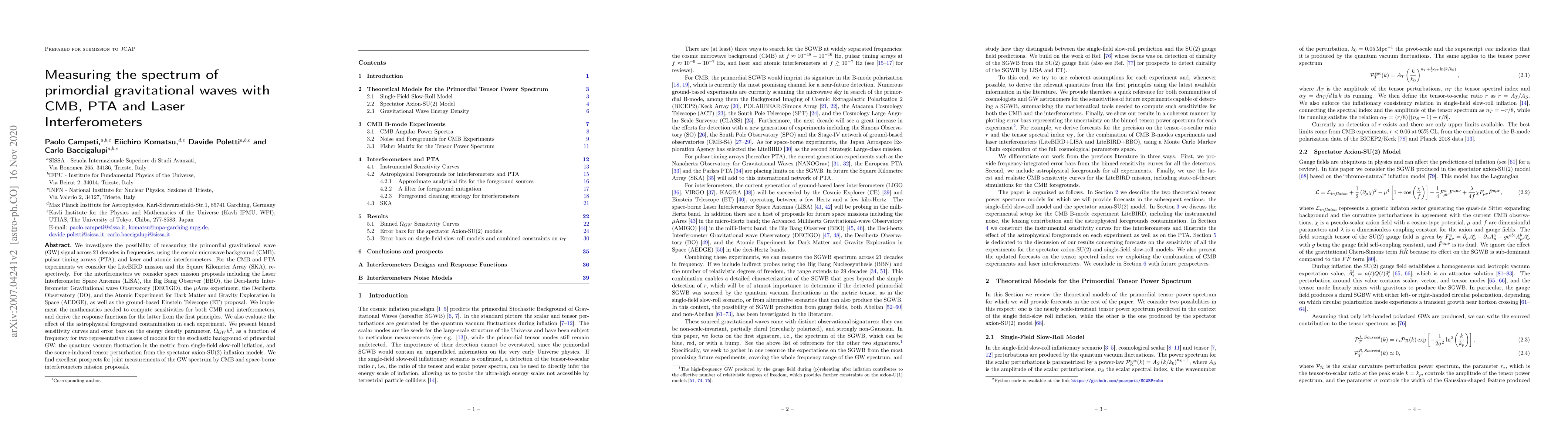 This paper explores the potential for measuring primordial gravitational waves across a wide frequency range using CMB, PTA, and laser interferometers. It evaluates the sensitivities of various missions and experiments, including LiteBIRD, SKA, LISA, and others, and assesses the impact of astrophysical foregrounds. The study finds promising prospects for joint measurements of the GW spectrum by combining CMB and space-borne interferometer missions.