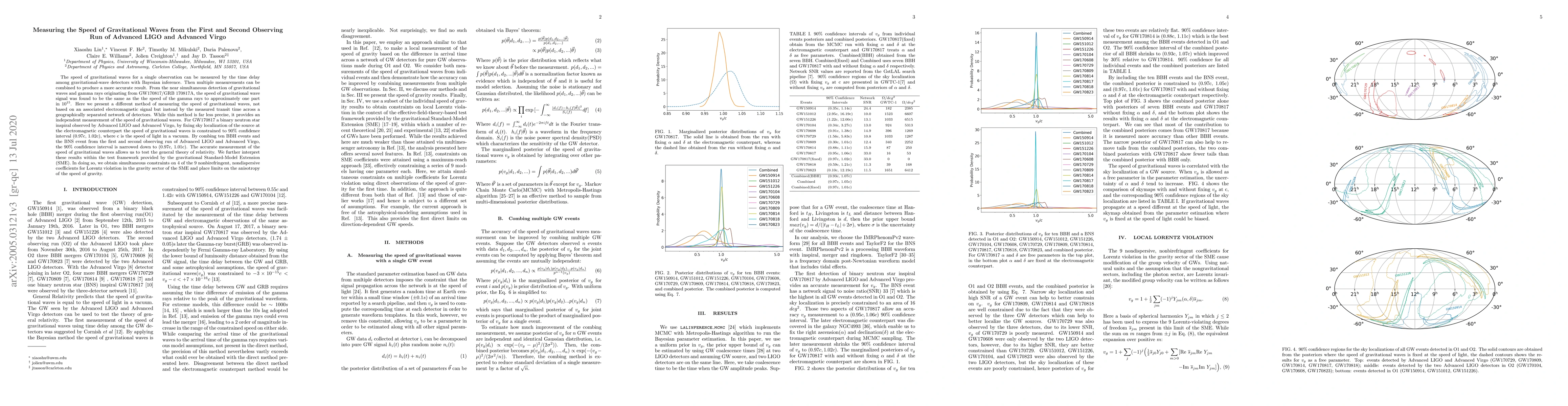 The speed of gravitational waves for a single observation can be measured by the time delay among gravitational-wave detectors with Bayesian inference. Then multiple measurements can be combined to produce a more accurate result. From the near simultaneous detection of gravitational waves and gamma rays originating from GW170817/GRB 170817A, the speed of gravitational wave signal was found to be the same as the the speed of the gamma rays to approximately one part in $10^{15}$. Here we present a different method of measuring the speed of gravitational waves, not based on an associated electromagnetic signal but instead by the measured transit time across a geographically separated network of detectors. While this method is far less precise, it provides an independent measurement of the speed of gravitational waves. For GW170817 a binary neutron star inspiral observed by Advanced LIGO and Advanced Virgo, by fixing sky localization of the source at the electromagnetic counterpart the speed of gravitational waves is constrained to 90% confidence interval (0.97c, 1.02c), where c is the speed of light in a vacuum. By combing seven BBH events and the BNS event from the second observing run of Advanced LIGO and Advanced Virgo, the 90% confidence interval is narrowed down to (0.97c, 1.01c). The accurate measurement of the speed of gravitational waves allows us to test the general theory of relativity. We further interpret these results within the test framework provided by the gravitational Standard-Model Extension (SME). In doing so, we obtain simultaneous constraints on 4 of the 9 nonbirefringent, nondispersive coefficients for Lorentz violation in the gravity sector of the SME and place limits on the anisotropy of the speed of gravity.