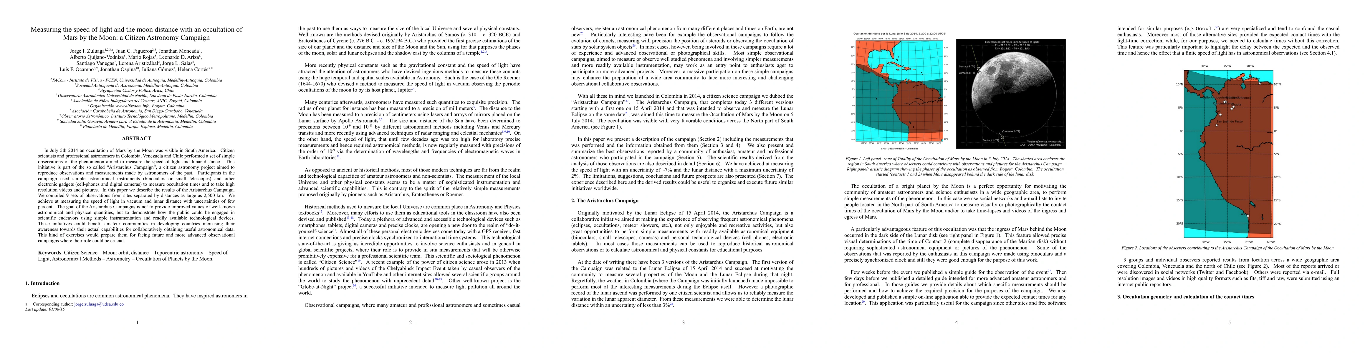 In July 5th 2014 an occultation of Mars by the Moon was visible in South America. Citizen scientists and professional astronomers in Colombia, Venezuela and Chile performed a set of simple observations of the phenomenon aimed to measure the speed of light and lunar distance. This initiative is part of the so called "Aristarchus Campaign", a citizen astronomy project aimed to reproduce observations and measurements made by astronomers of the past. Participants in the campaign used simple astronomical instruments (binoculars or small telescopes) and other electronic gadgets (cell-phones and digital cameras) to measure occultation times and to take high resolution videos and pictures. In this paper we describe the results of the Aristarchus Campaign. We compiled 9 sets of observations from sites separated by distances as large as 2,500 km. We achieve at measuring the speed of light in vacuum and lunar distance with uncertainties of few percent. The goal of the Aristarchus Campaigns is not to provide improved values of well-known astronomical and physical quantities, but to demonstrate how the public could be engaged in scientific endeavors using simple instrumentation and readily available technological devices. These initiatives could benefit amateur communities in developing countries increasing their awareness towards their actual capabilities for collaboratively obtaining useful astronomical data. This kind of exercises would prepare them for facing future and more advanced observational campaigns where their role could be crucial.