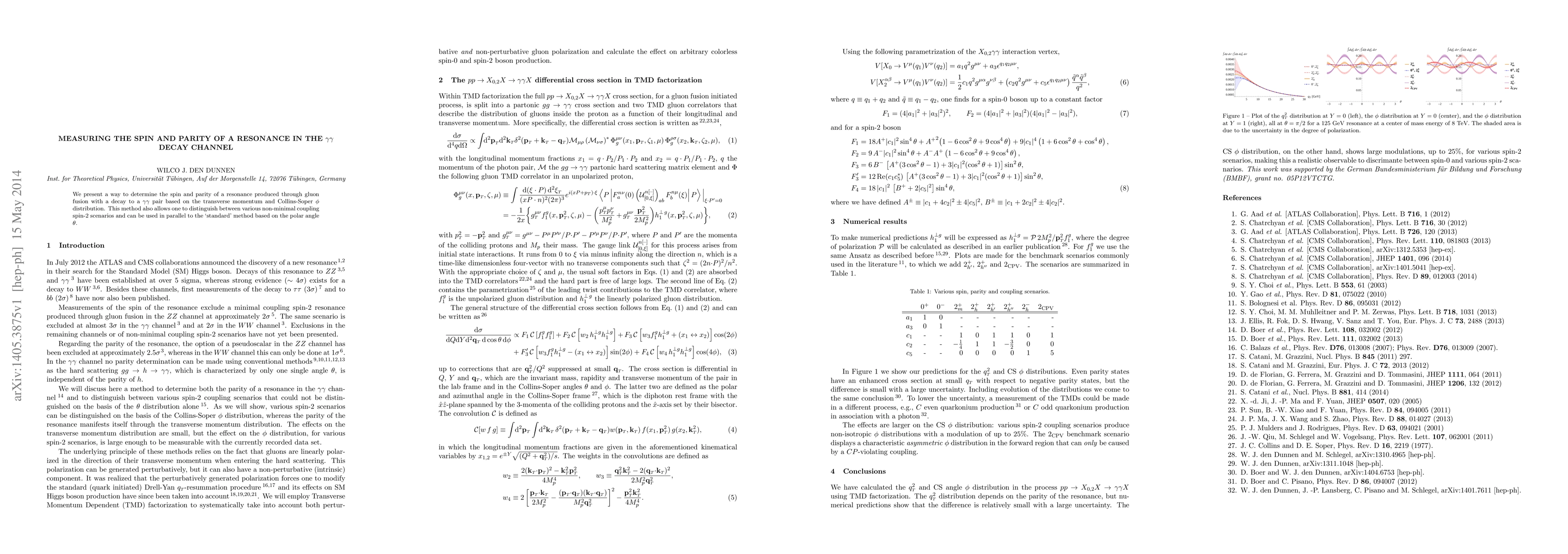 We present a way to determine the spin and parity of a resonance produced through gluon fusion with a decay to a $\gamma\gamma$ pair based on the transverse momentum and Collins-Soper $\phi$ distribution. This method also allows one to distinguish between various non-minimal coupling spin-2 scenarios and can be used in parallel to the `standard' method based on the polar angle $\theta$.