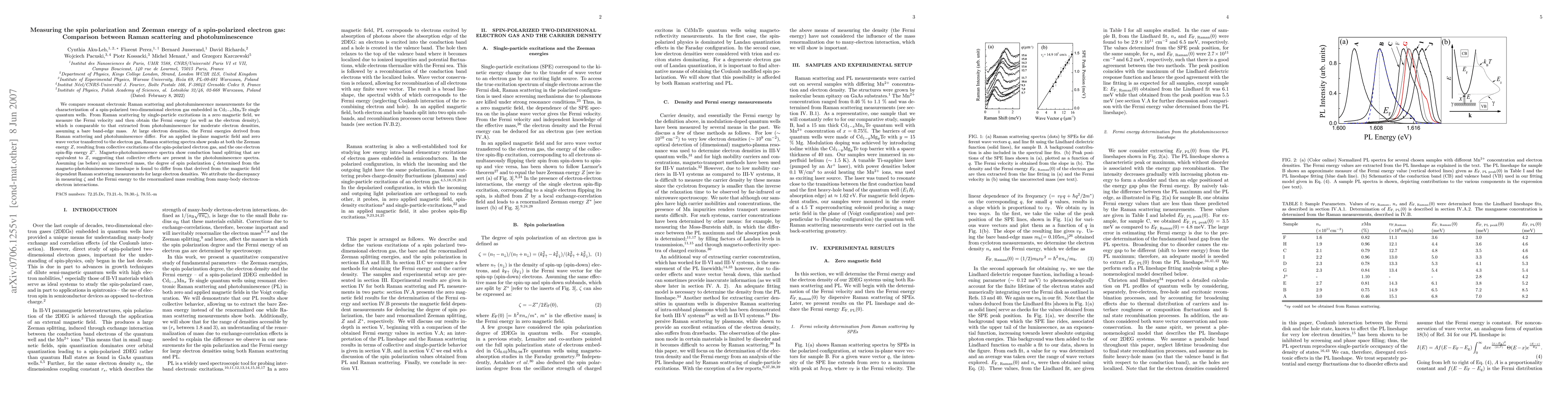 We compare resonant electronic Raman scattering and photoluminescence measurements for the characterization of a spin-polarized two-dimensional electron gas embedded in $\text{Cd}_{1-x}\text{Mn}_x\text{Te}$ single quantum wells. From Raman scattering by single-particle excitations in a zero magnetic field, we measure the Fermi velocity and then obtain the Fermi energy (as well as the electron density), which is comparable to that extracted from photoluminescence for moderate electron densities, assuming a bare band-edge mass. At large electron densities, the Fermi energies derived from Raman scattering and photoluminescence differ. For an applied in-plane magnetic field and zero wave vector transferred to the electron gas, Raman scattering spectra show peaks at both the Zeeman energy $Z$, resulting from collective excitations of the spin-polarized electron gas, and the one electron spin-flip energy $Z^*$. Magneto-photoluminescence spectra show conduction band splitting that are equivalent to $Z$, suggesting that collective effects are present in the photoluminescence spectra. Assuming (as before) an uncorrected mass, the degree of spin polarization $\zeta$ determined from the magneto-photoluminescence lineshape is found to differ from that derived from the magnetic field dependent Raman scattering measurements for large electron densities. We attribute the discrepancy in measuring $\zeta$ and the Fermi energy to the renormalized mass resulting from many-body electron-electron interactions.