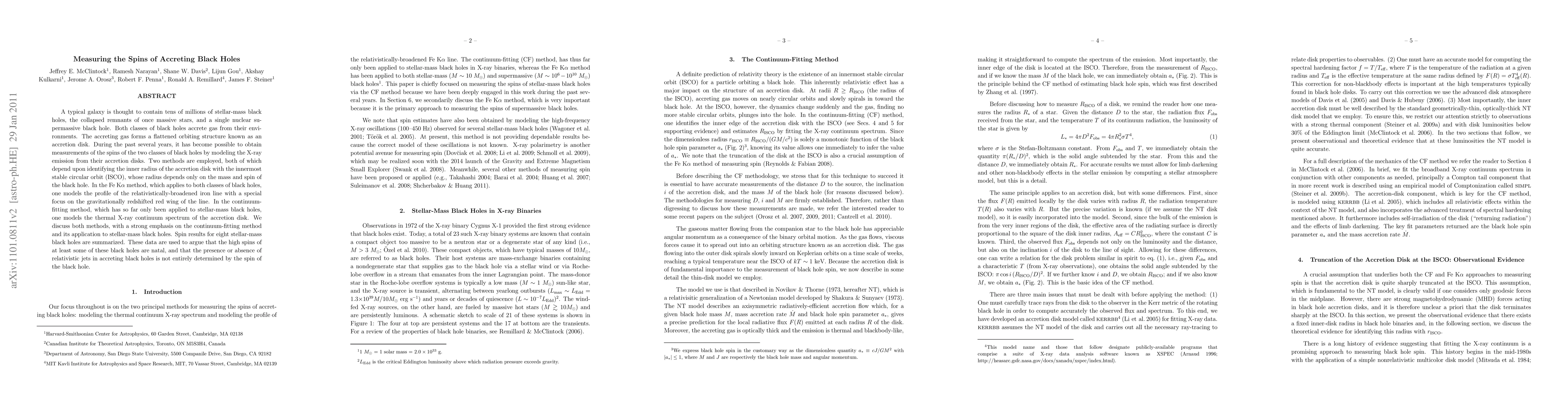 This paper explores methods to measure the spins of accreting black holes, focusing on the continuum-fitting method for stellar-mass black holes. It summarizes spin results for eight stellar-mass black holes, suggesting some high spins are natal and that jet presence is not solely dependent on black hole spin.