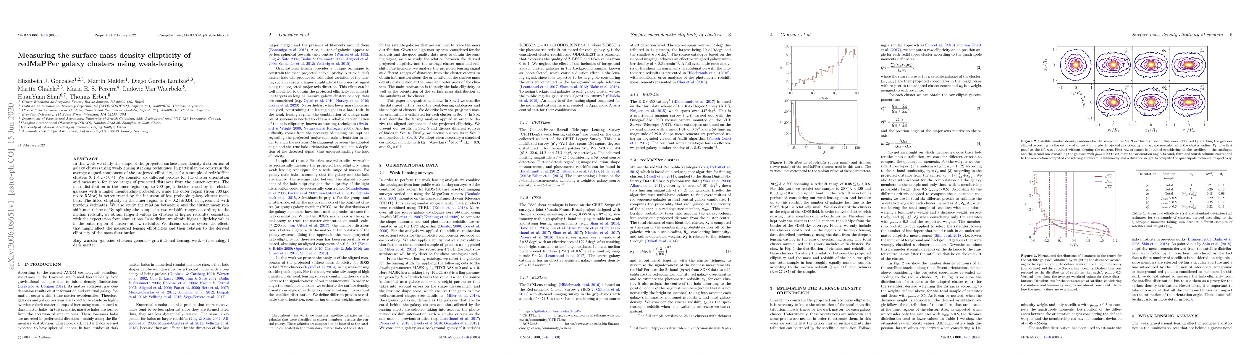 In this work we study the shape of the projected surface mass density distribution of galaxy clusters using weak-lensing stacking techniques. In particular, we constrain the average aligned component of the projected ellipticity, $\epsilon$, for a sample of redMaPPer clusters ($0.1 \leq z < 0.4$). We consider six different proxies for the cluster orientation and measure $\epsilon$ for three ranges of projected distances from the cluster centres. The mass distribution in the inner region (up to $700\,$kpc) is better traced by the cluster galaxies with a higher membership probability, while the outer region (from $700\,$kpc up to $5\,$Mpc) is better traced by the inclusion of less probable galaxy cluster members. The fitted ellipticity in the inner region is $\epsilon = 0.21 \pm 0.04$, in agreement with previous estimates. We also study the relation between $\epsilon$ and the cluster mean redshift and richness. By splitting the sample in two redshift ranges according to the median redshift, we obtain larger $\epsilon$ values for clusters at higher redshifts, consistent with the expectation from simulations. In addition, we obtain higher ellipticity values in the outer region of clusters at low redshifts. We discuss several systematic effects that might affect the measured lensing ellipticities and their relation to the derived ellipticity of the mass distribution.