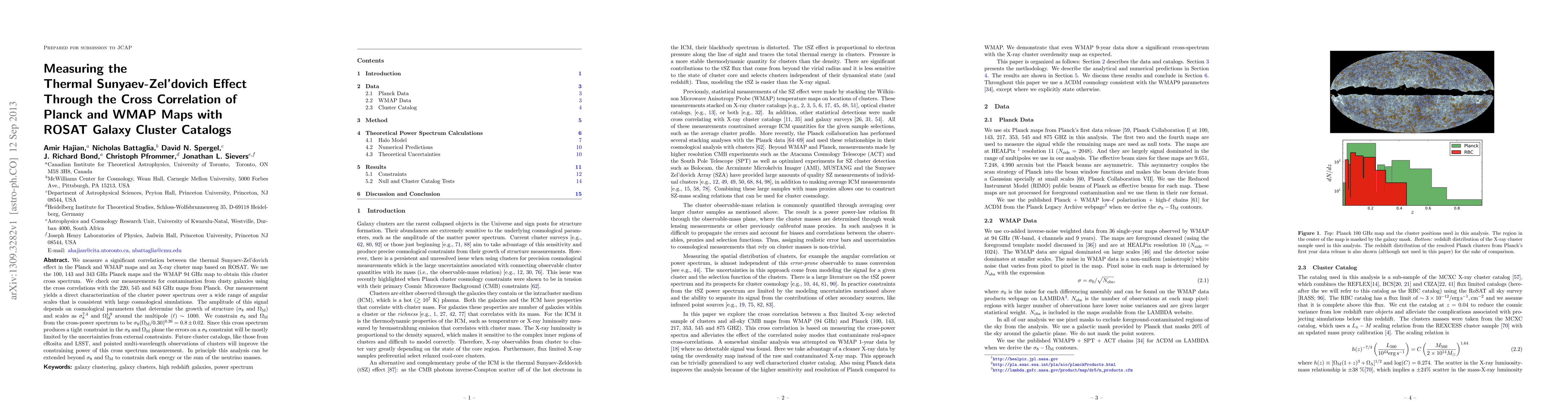 This study measures the thermal Sunyaev-Zel'dovich effect by correlating Planck and WMAP maps with ROSAT galaxy clusters, yielding a cluster power spectrum consistent with cosmological simulations. The analysis constrains the growth parameters σ_8 and Ω_M, suggesting future observations could further refine these constraints and potentially extend to dark energy or neutrino masses.