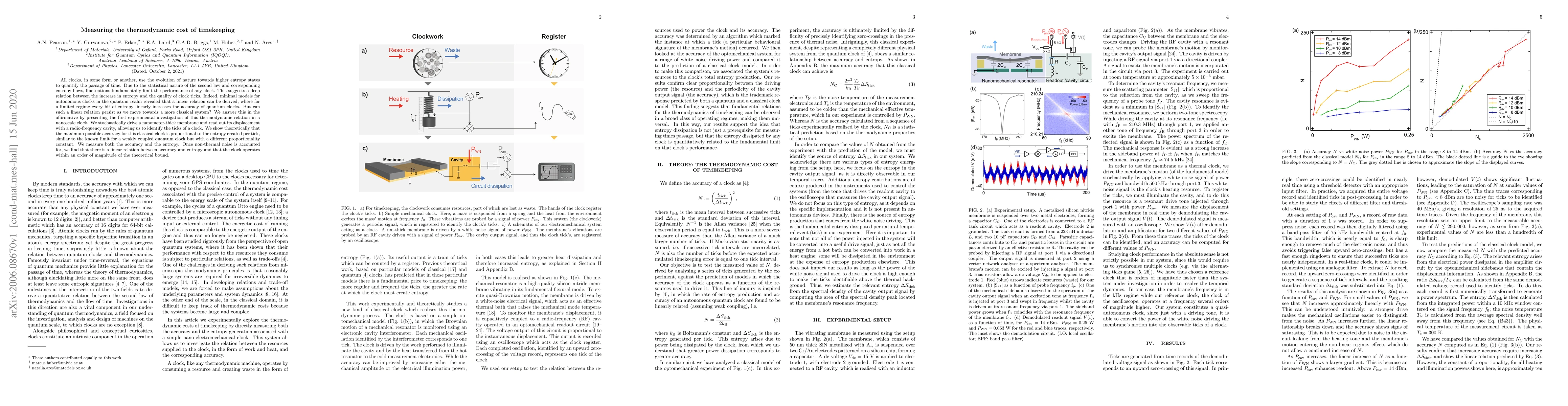 All clocks, in some form or another, use the evolution of nature towards higher entropy states to quantify the passage of time. Due to the statistical nature of the second law and corresponding entropy flows, fluctuations fundamentally limit the performance of any clock. This suggests a deep relation between the increase in entropy and the quality of clock ticks. Indeed, minimal models for autonomous clocks in the quantum realm revealed that a linear relation can be derived, where for a limited regime every bit of entropy linearly increases the accuracy of quantum clocks. But can such a linear relation persist as we move towards a more classical system? We answer this in the affirmative by presenting the first experimental investigation of this thermodynamic relation in a nanoscale clock. We stochastically drive a nanometer-thick membrane and read out its displacement with a radio-frequency cavity, allowing us to identify the ticks of a clock. We show theoretically that the maximum possible accuracy for this classical clock is proportional to the entropy created per tick, similar to the known limit for a weakly coupled quantum clock but with a different proportionality constant. We measure both the accuracy and the entropy. Once non-thermal noise is accounted for, we find that there is a linear relation between accuracy and entropy and that the clock operates within an order of magnitude of the theoretical bound.