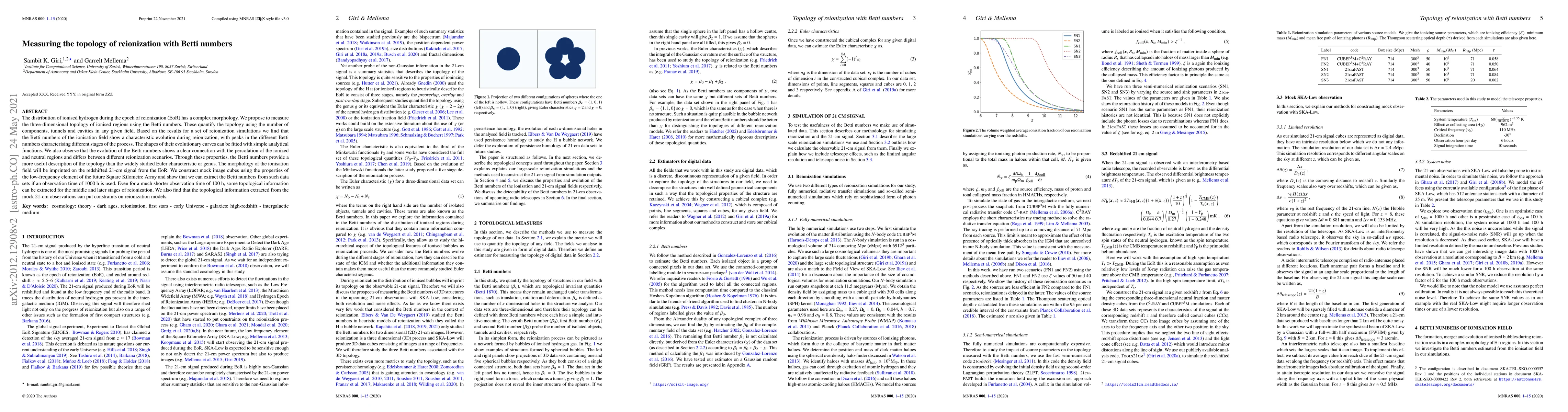 This paper proposes using Betti numbers to measure the three-dimensional topology of ionized hydrogen regions during the epoch of reionization, finding that these numbers reveal distinct evolutionary stages and percolation patterns. The study demonstrates that Betti numbers provide a more nuanced description than the Euler characteristic, and they can be extracted from future 21-cm observations, offering constraints on reionization models.
