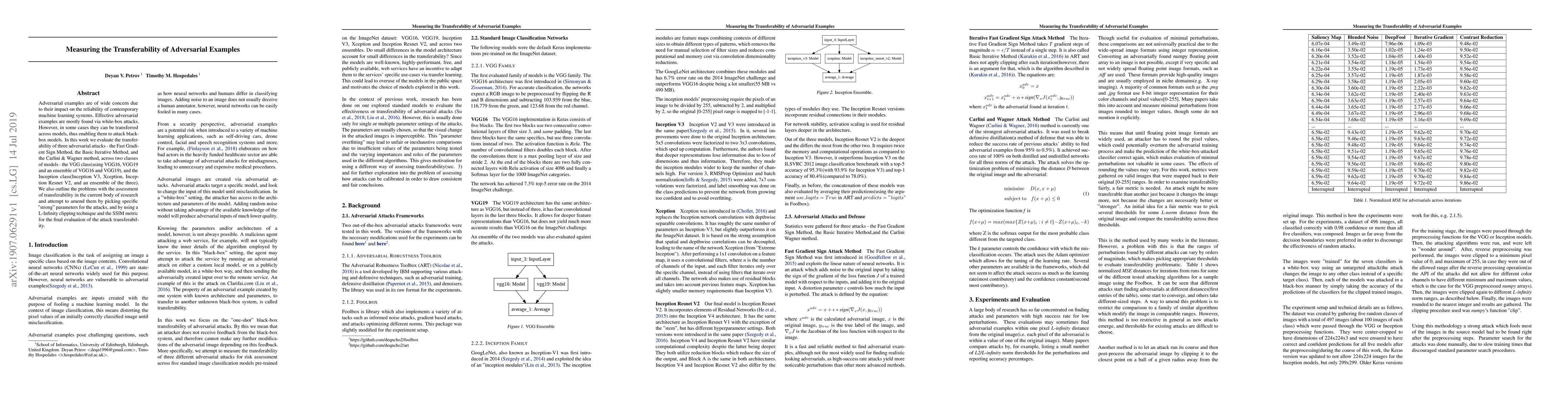 Adversarial examples are of wide concern due to their impact on the reliability of contemporary machine learning systems. Effective adversarial examples are mostly found via white-box attacks. However, in some cases they can be transferred across models, thus enabling them to attack black-box models. In this work we evaluate the transferability of three adversarial attacks - the Fast Gradient Sign Method, the Basic Iterative Method, and the Carlini & Wagner method, across two classes of models - the VGG class(using VGG16, VGG19 and an ensemble of VGG16 and VGG19), and the Inception class(Inception V3, Xception, Inception Resnet V2, and an ensemble of the three). We also outline the problems with the assessment of transferability in the current body of research and attempt to amend them by picking specific "strong" parameters for the attacks, and by using a L-Infinity clipping technique and the SSIM metric for the final evaluation of the attack transferability.