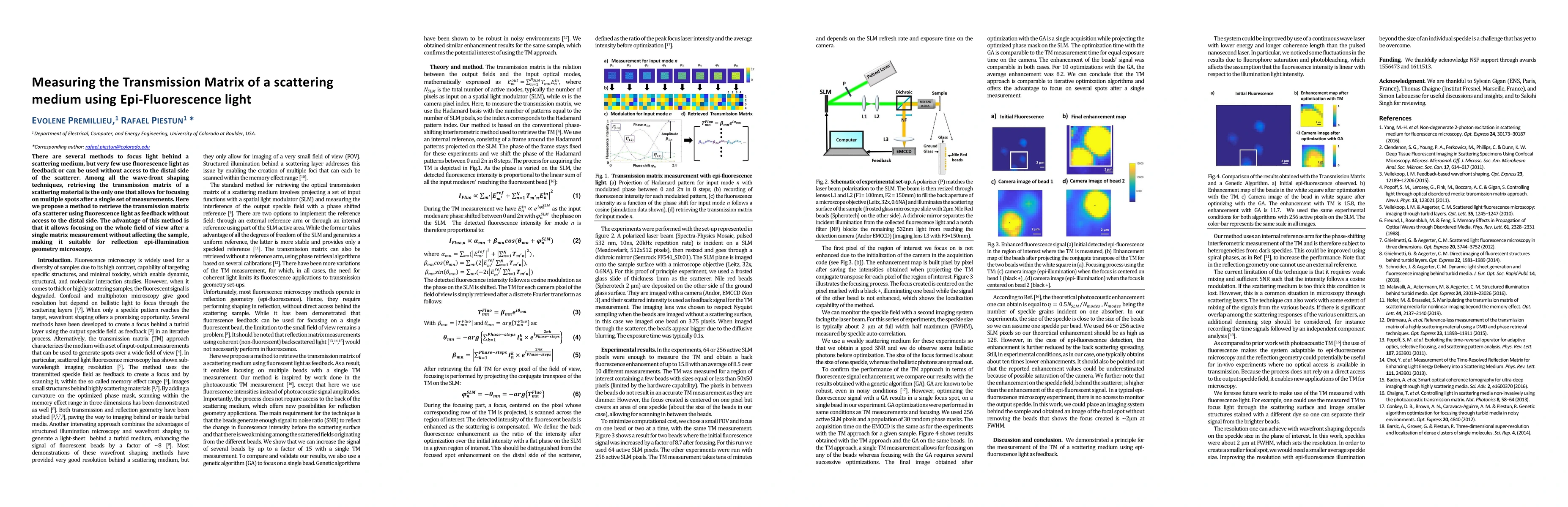 The paper introduces a novel method for measuring the transmission matrix of a scattering medium using epi-fluorescence light as feedback, employing an internal reference arm for phase-shifting interferometric measurements.