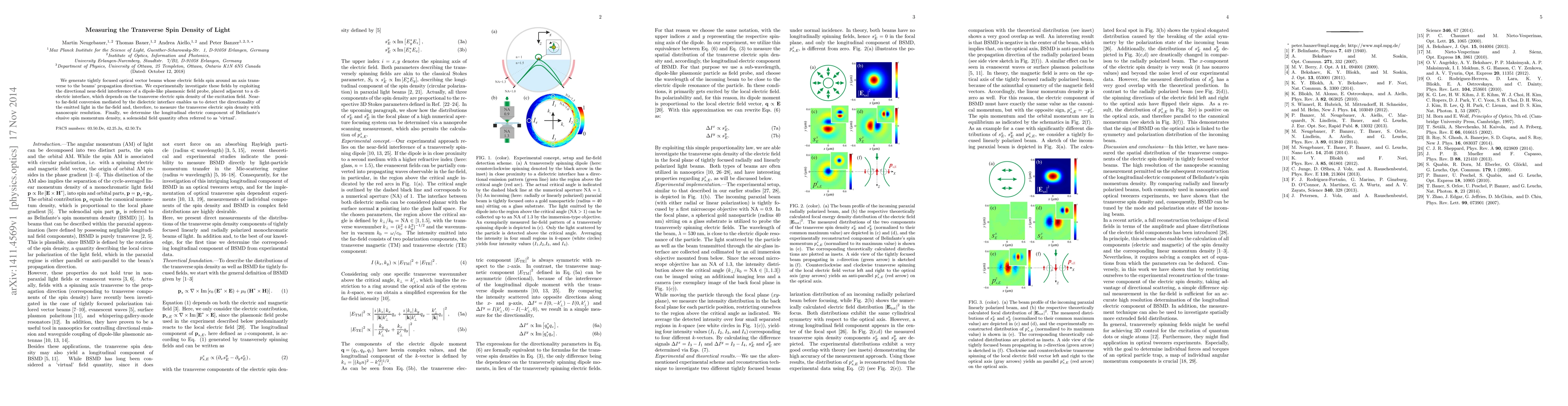 We generate tightly focused optical vector beams whose electric fields spin around an axis transverse to the beams' propagation direction. We experimentally investigate these fields by exploiting the directional near-field interference of a dipole-like plasmonic field probe, placed adjacent to a dielectric interface, which depends on the transverse electric spin density of the excitation field. Near- to far-field conversion mediated by the dielectric interface enables us to detect the directionality of the emitted light in the far-field and, therefore, to measure the transverse electric spin density with nanoscopic resolution. Finally, we determine the longitudinal electric component of Belinfante's elusive spin momentum density, a solenoidal field quantity often referred to as 'virtual'.