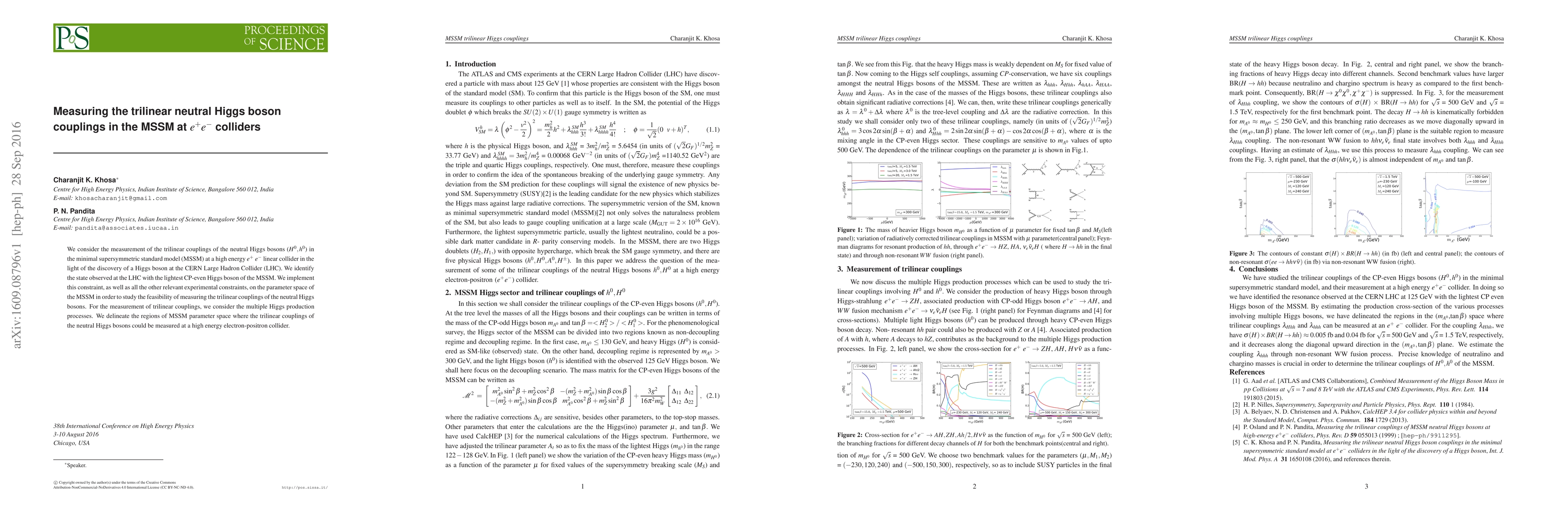 This paper investigates the feasibility of measuring trilinear neutral Higgs boson couplings in the MSSM at high-energy $e^+ e^-$ colliders, considering the constraints from the observed Higgs boson at the LHC. It identifies promising regions of MSSM parameter space where these couplings can be detected through multiple Higgs production processes.