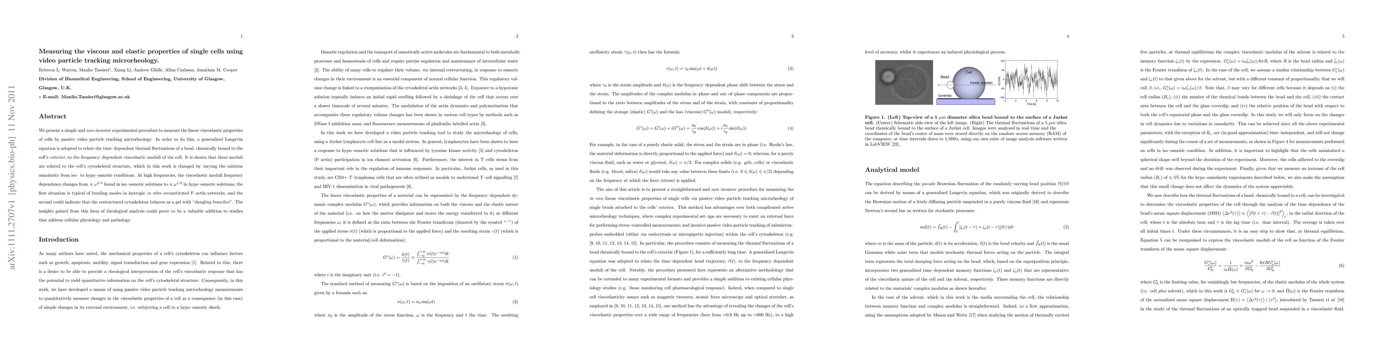 This paper introduces a non-invasive method using video particle tracking microrheology to measure the linear viscoelastic properties of single cells. The study reveals changes in the cell's cytoskeletal structure under varying osmolarity, providing insights into cellular physiology and pathology.