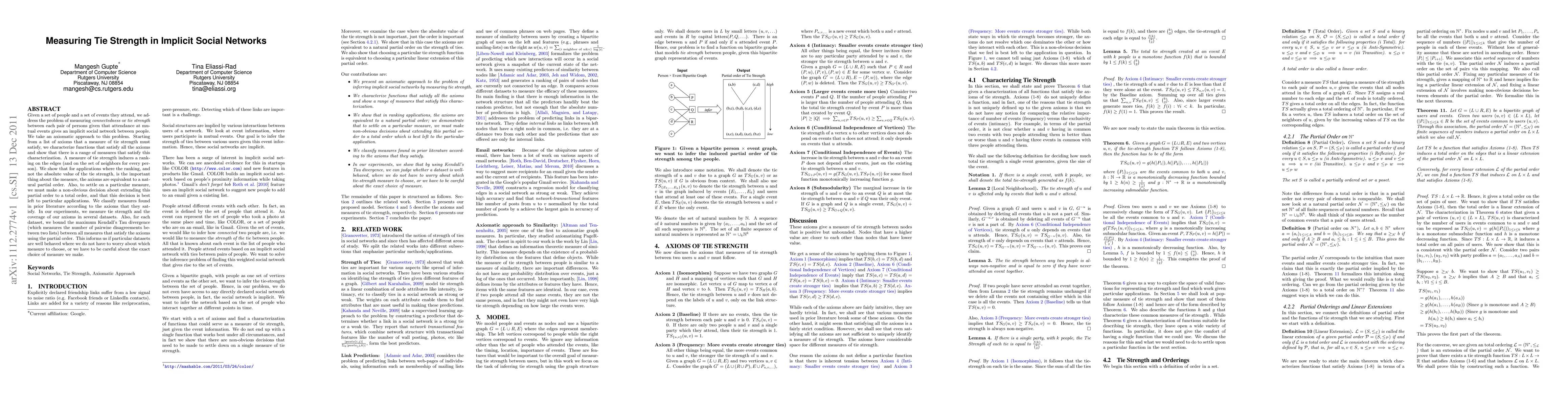 Given a set of people and a set of events they attend, we address the problem of measuring connectedness or tie strength between each pair of persons given that attendance at mutual events gives an implicit social network between people. We take an axiomatic approach to this problem. Starting from a list of axioms that a measure of tie strength must satisfy, we characterize functions that satisfy all the axioms and show that there is a range of measures that satisfy this characterization. A measure of tie strength induces a ranking on the edges (and on the set of neighbors for every person). We show that for applications where the ranking, and not the absolute value of the tie strength, is the important thing about the measure, the axioms are equivalent to a natural partial order. Also, to settle on a particular measure, we must make a non-obvious decision about extending this partial order to a total order, and that this decision is best left to particular applications. We classify measures found in prior literature according to the axioms that they satisfy. In our experiments, we measure tie strength and the coverage of our axioms in several datasets. Also, for each dataset, we bound the maximum Kendall's Tau divergence (which measures the number of pairwise disagreements between two lists) between all measures that satisfy the axioms using the partial order. This informs us if particular datasets are well behaved where we do not have to worry about which measure to choose, or we have to be careful about the exact choice of measure we make.