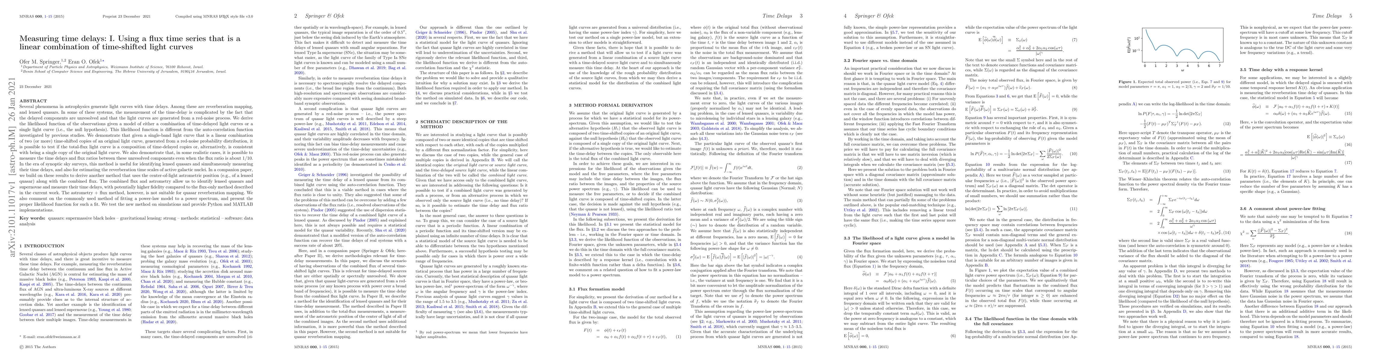 (Abridged) Several phenomena in astrophysics generate light curves with time delays. Among these are reverberation mapping, and lensed quasars. In some systems, the measurement of the time-delay is complicated by the fact that the delayed components are unresolved and that the light curves are generated from a red-noise process. We derive the likelihood function of the observations given a model of either a combination of time-delayed light curves or a single light curve. This likelihood function is different from the auto-correlation function. We demonstrate that given a single-band light curve that is a combination of two (or more) time-shifted copies of an original light curve, generated from a red-noise probability distribution, we can test if the total-flux light curve is a composition of time-delayed copies or, alternatively, is consistent with being the original light curve. Furthermorew, in some realistic cases, it is possible to measure the time delays and flux ratios between these unresolved components even when the flux ratio is about 1/10. This method is useful for identifying lensed quasars and simultaneously measuring their time delays, and for estimating the reverberation time scales of active galactic nuclei. In a companion paper, we derive a method that uses the center-of-light position (e.g., of a lensed quasar) along with the combined flux. This allow us to identify lensed quasars and supernovae and measure their time delays, with higher fidelity compared to the flux-only method. The astrometry + flux method, however, is not suitable for quasar reverberation mapping. We also comment on the commonly used method of fitting a power-law model to a power spectrum, and present the proper likelihood function for such a fit. We test the new method on simulations and provide Python and MATLAB implementations.